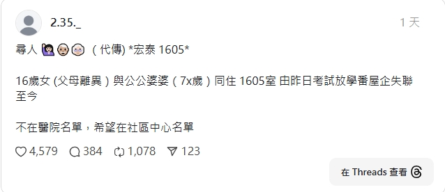 兩人也在社群平台Threads發文求助,盼望透過網路的力量獲得更多線索,同時懇請媒體協助擴散訊息,只願能早日找到黎凱琪等人的下落,結束這場煎熬的等待。消息曝光後,許多網友紛紛留言表達不捨:「看到最後訊息真的好心疼,希望能平安無事」、「拜託一定要找到人,為家屬加油打氣」、「那句好辛苦看了好難過,祈禱奇蹟出現」、「真的太殘忍了,希望她和家人都能平安歸來」、「大家一起幫忙轉發,集氣讓他們早日團圓」。