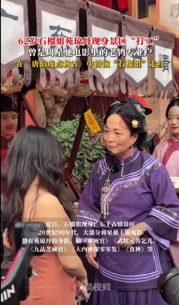 62歲香港演員苑瓊丹於1983年出道,曾演過多部周星馳參與的電影,其中又以《唐伯虎點秋香》石榴姐角色最為經典。怎料知名度相當高的她,近日卻被目擊現身廣東千古情景區,帶領遊客合唱經典粵語老歌,意外引發熱烈討論。