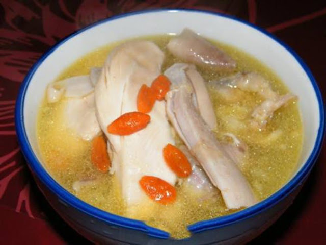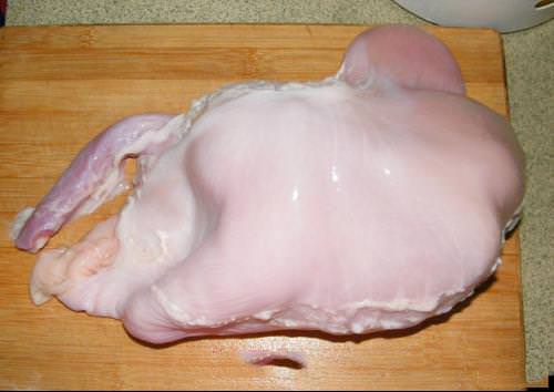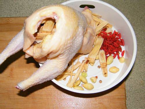3,把枸杞除外的輔料塞一半的量到雞的肚子裡(把雞頭與雞腳砍掉先)