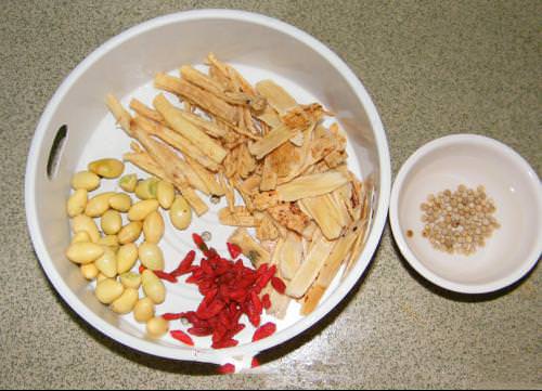 2,上輔料,這裡準備的有:黨參,白果,小北芪,枸杞,還有不可缺少的胡椒料約40粒。這些在超市都能買到的。