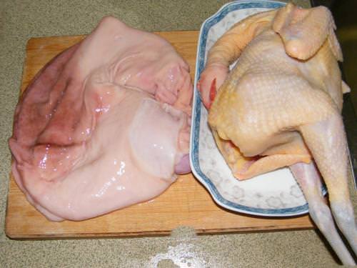 4,再把雞塞到豬肚裡,本來豬肚口子要紮起來的,找不到線之類的,就用雞頭與雞腳堵上了,這樣也不會漏