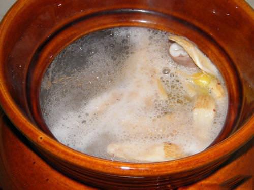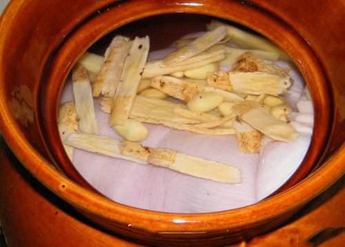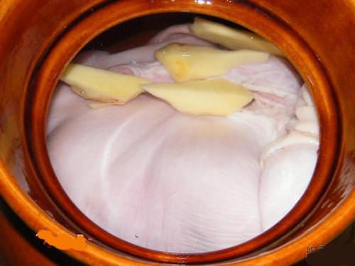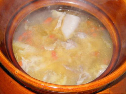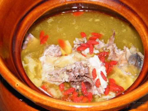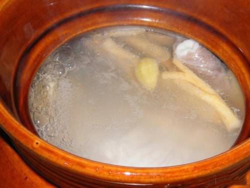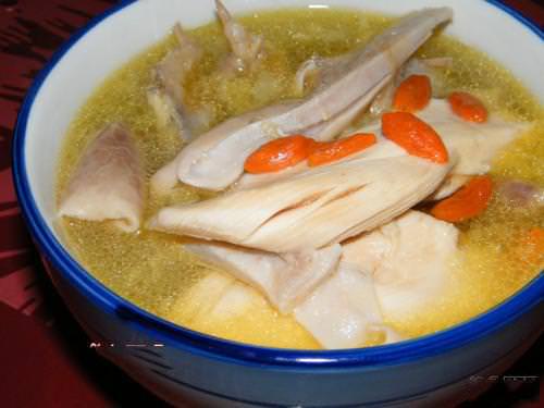 12,戴上一次性手套,把豬肚切成長條,雞實在是軟,改成手撕...再把切好的豬肚與雞塊放回砂鍋裡(請把裡面的藥材渣子撈出來不要),這時放下枸杞,還需要再滾10分鐘
