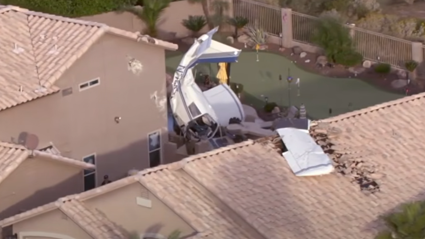 從當地電視台的空拍畫面能清楚看見,這架輕型機先是撞上其中一戶人家的屋頂,接著整架飛機以機頭朝下的姿態,重重砸進另一戶民宅的後院。巨大的撞擊力道讓飛機機身嚴重變形扭曲,現場一片狼藉。事發地點位於卡夫克里路與鹿谷大道附近的社區,當時正值清晨時段。