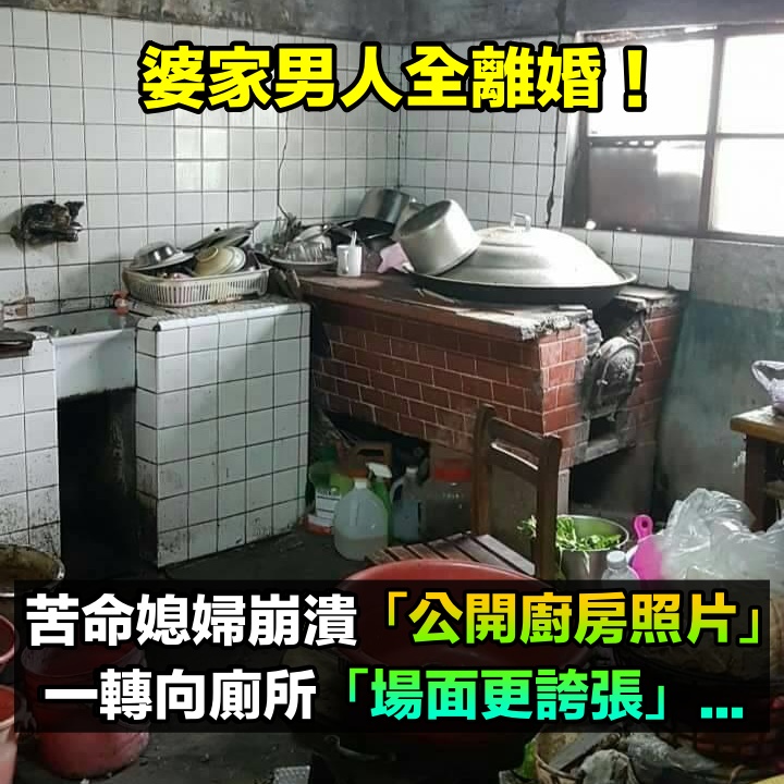 婆家男人全離婚!苦命媳婦「公開廚房照片」痛訴悲情經歷 廁所照更誇張.... 中距離神射手 2026-01-26 檢舉 圖片來源:爆怨公社 臉書許多網友也勸告原PO要懂得保護自己,「還等什麼現世報?這位施主妳快逃比較要緊」、「娶一個就要顧到他們一家子,還要自己倒貼,覺得你跟你老公搬出去吧」、「與其空等現世報,倒不如勇敢點,拒絕這樣的苦差事」、「娶傭人嗎?要是我早就跑了」。圖片來源:爆怨公社 臉書 Advertisements 還是希望原PO快逃吧,就算沒被婆家操死,心理狀態遲早會出狀況的!資料來源:TEEPR亮新聞 Advertisements 回首頁 2/2 Advertisements 編輯精選推薦 More + 婚變尪落跑!單親媽「獨扛千萬債養孩」到處躲黑道 「一開口驚艷眾人」熬成台灣歌后 最新/賈靜雯深夜慟曝「她已離世」 淚PO合照喊:真的好愛你... 昏迷2度開顱手術!王月消失兩個月「女兒曝最新病況」 陳鴻鼻酸「等妳一起去公證」 相差18歲!58歲康康自爆「與老婆分房12年」驚呆眾人 提到沈玉琳「坦言罹同1病」:必須警惕... 行善多年悄離世!知名男星設靈「半個演藝圈來送行」 人才剛走「兒子入獄、孫子身亡」下場太唏噓... 趕在40歲前閃婚!八點檔女星「宣布嫁給他」 尪驚人身分曝「媒人是柯叔元」 台語歌后慟別摯愛!告別式上認「早隱瞞病情」 道歉哭喊:原諒我簽放棄急救 昨天還一起跳舞!亞馬遜部落突翻臉「嚮導遭200人圍攻」 他慘被2公尺貫穿 24歲兒失明!于美人爆「他在飯店掃廁所」維生 不盼紅包只求「別再花我的錢」 韓國出境新規定!一票台灣人「關進小房間檢查」網驚:之前帶都沒事 本土劇女星生了!7年前凍卵「終於來到我身邊」 歌手尪嗨喊:生個足球隊 勞退新制大變革!月領、一次領變了「全台千萬人受影響」 45歲本土劇男星「驚曝已婚16年」! 首吐婚姻狀況「愛女是名校學霸」 22歲愛女病逝!資深男星「走不出喪女痛」留白長髮現身 掛骨灰項鍊「代女做1事」惹淚 65歲男星獨居暴斃!大咖女星放下恩怨「送前夫最後一程」 昔遭動手6年嘆「死者為大」 以為只是小感冒!本土女星悲痛證實「他併發肺炎過世」 一度淚灑現場「後悔同意插管」 85歲失智父身亡!林葉亭突宣布「皈依佛門」 遇大師「開示一番話」忍不住淚崩 一年7000人大腸癌過世!醫示警 「耳朵、臉出現1徵兆」趕快就醫 晚年隱居台東!68歲名主持失蹤「車內身亡」 伴侶悲曝「死前做1事」:還掛念著我 弟成植物人、姊猝逝!玉女歌手「遭前夫設套」騙走娘家房產 「狠斬16年婚姻」近況曝 快訊/大型渡輪「滿載350人」驚傳沉沒!「遺體漂浮海上」傷亡人數曝光... 離婚11年!洪榮宏愛女結婚「終破冰前妻」 「2爸爸牽她進場」催淚畫面曝 功德圓滿了!台語歌后「悲曝他離世」享壽95歲 淚喊:去當快樂的神仙吧... 「我寧可生兩個兒子,也不要一個女兒!」一位媽媽說出心裡話:「理由很現實」不是重男輕女 台灣大咖病逝「享壽83歲」!周遊告別式痛哭「認婚內出軌」:兒子很恨我...