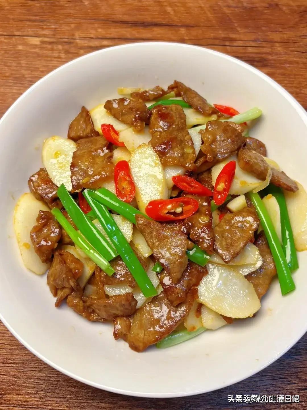 2. 牛肉切片,用少許淡醬油、澱粉抓勻醃製,口感更嫩。