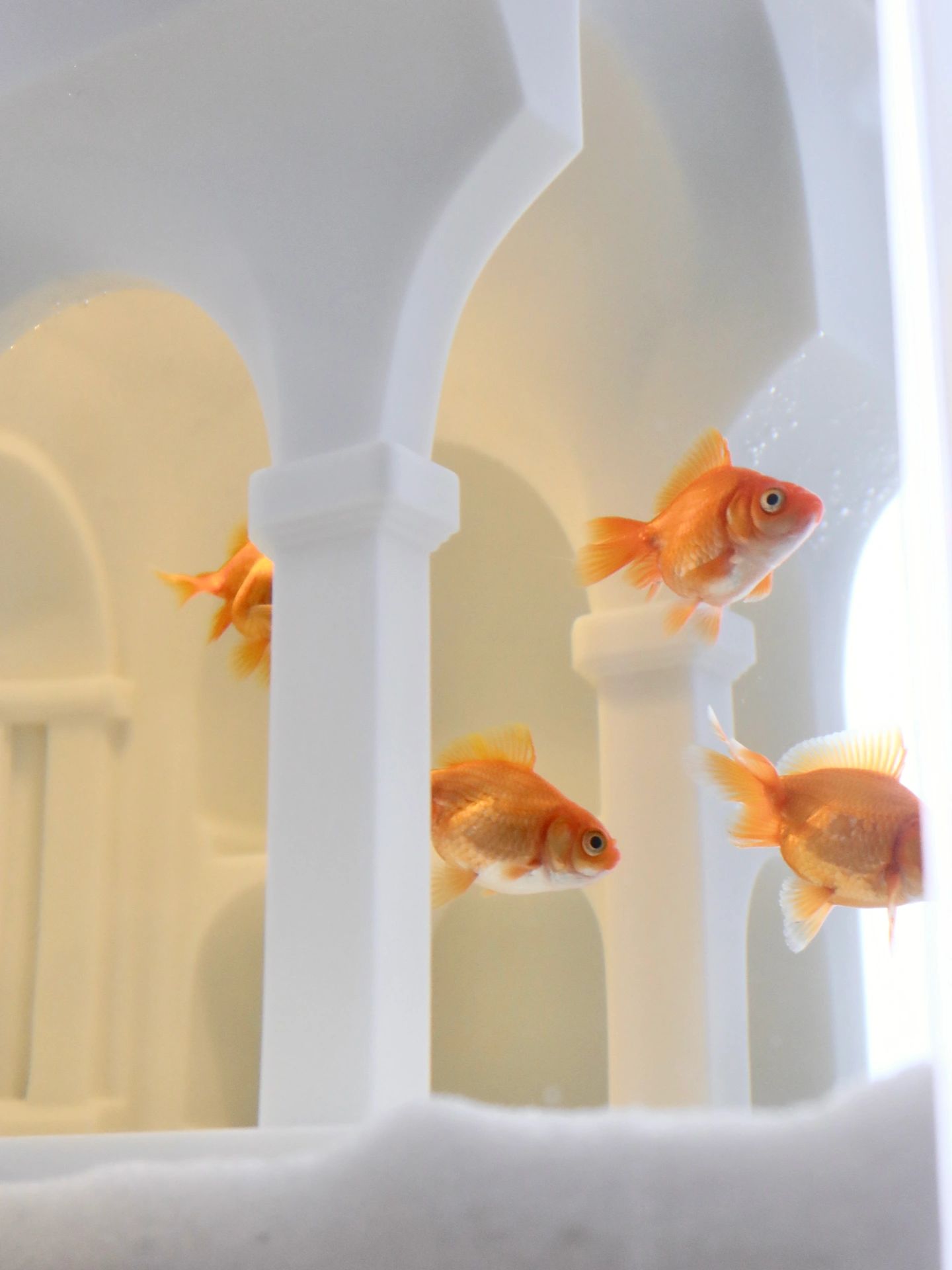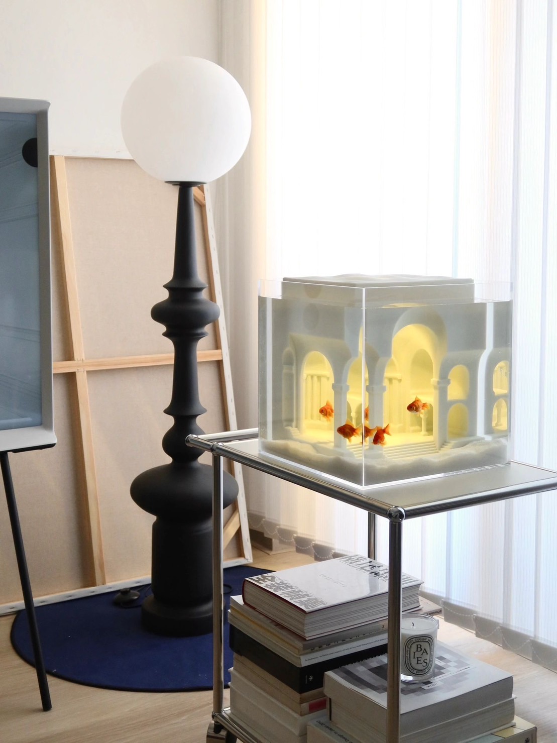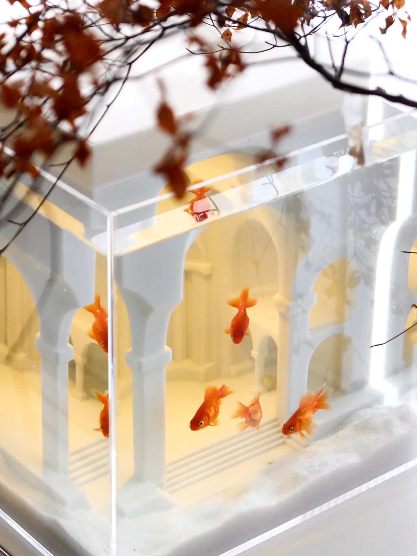 透明玻璃魚缸裡出現了白色城堡造景,看起來非常有質感且漂亮,加上頂部結構為了可以放燈泡,做了個凹槽,如此一來還能解決插電線醜醜的樣子,加上一點白沙做鋪墊,真的太美了啦~