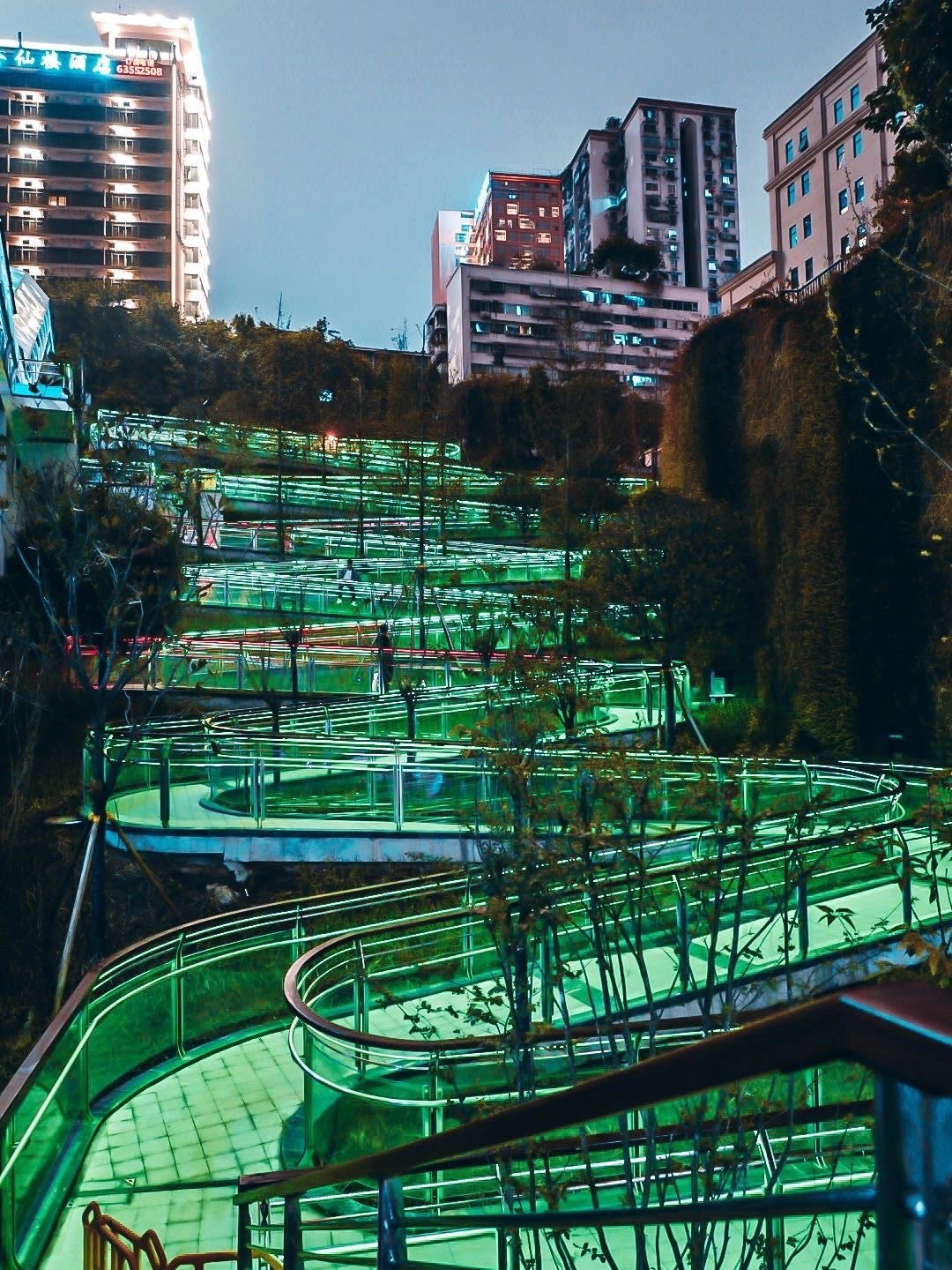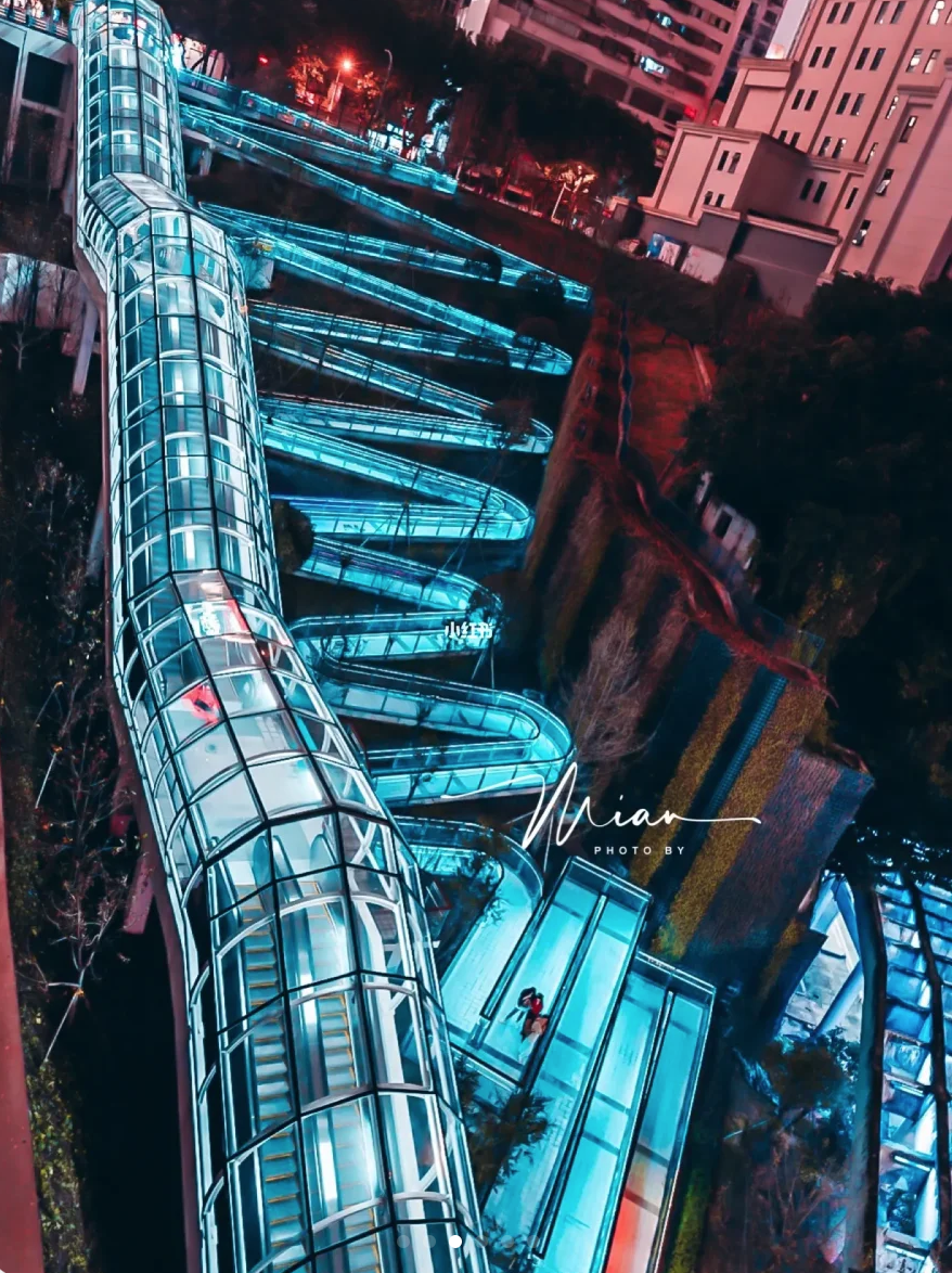 從空拍視角下,閃閃發亮的螢光感蜿蜒彎道,還會隨著變換顏色,有種很像在看飆速賽車穿梭而去的視覺殘留,留下一道道光速感的圖像的感覺,整體視角下真的太漂亮啦~~~