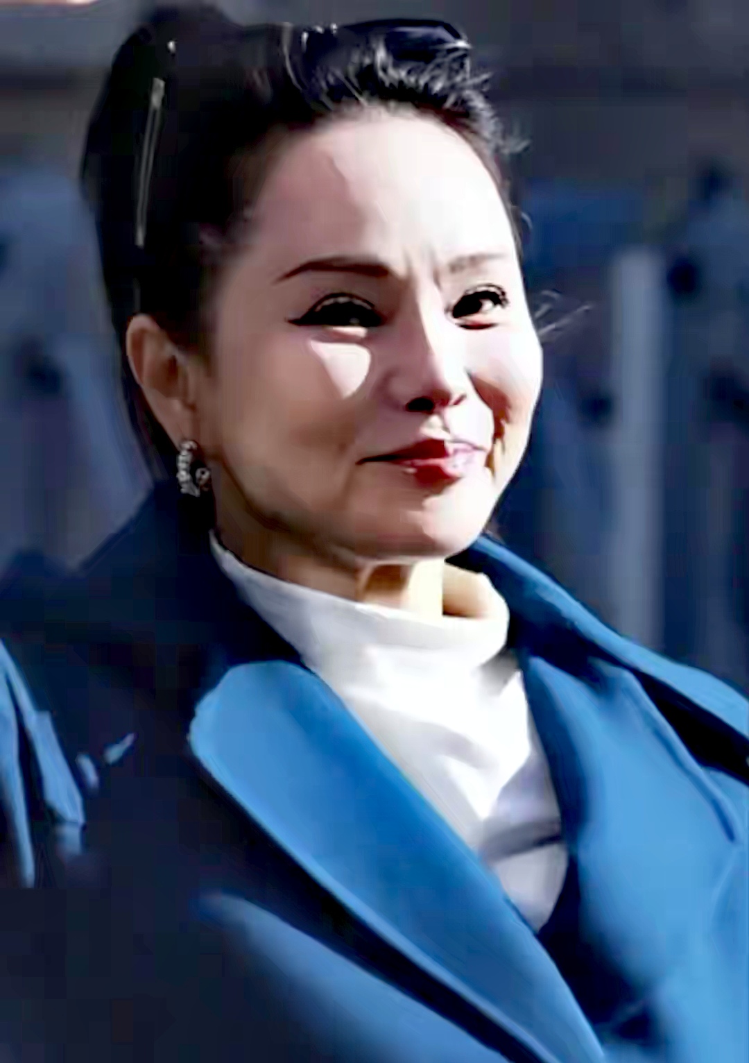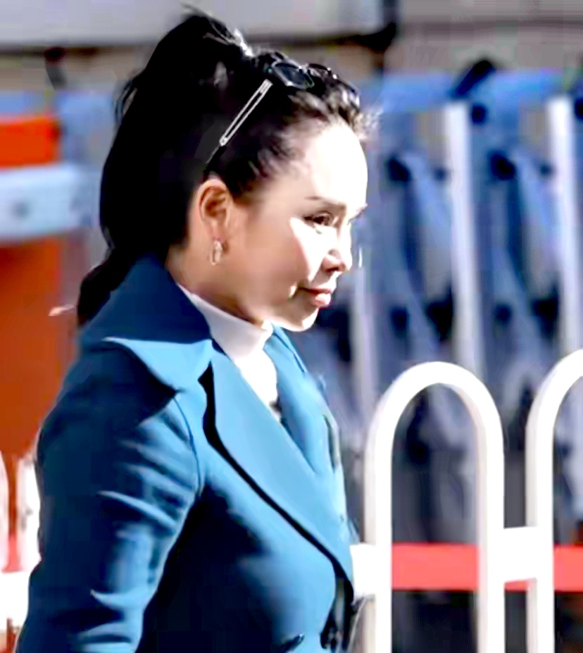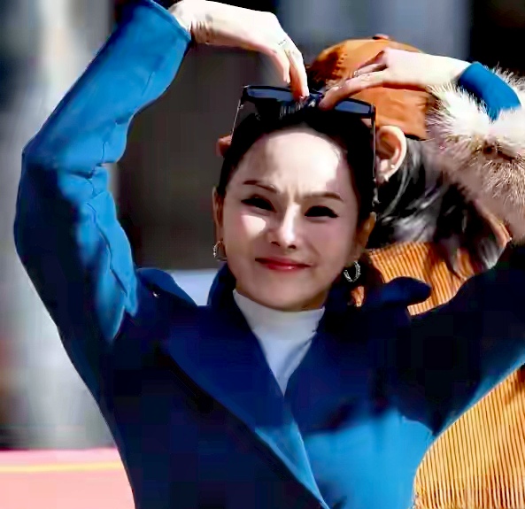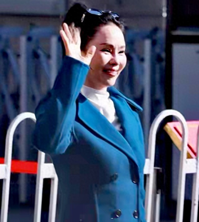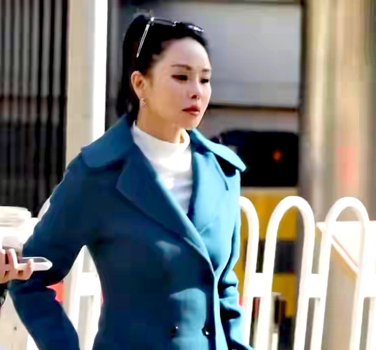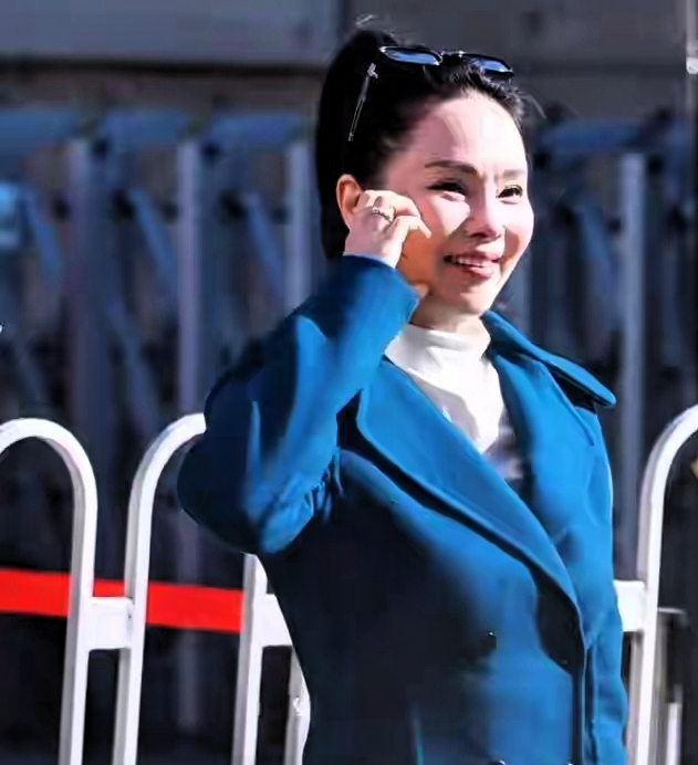 57歲的伊能靜那天穿了件深藍色大衣,妝容挺精緻,還架著副墨鏡。可能是想顯得幹練精神些,她把頭髮全部往後梳,弄了個「大光明」髮型,整張臉一點遮擋都沒有。