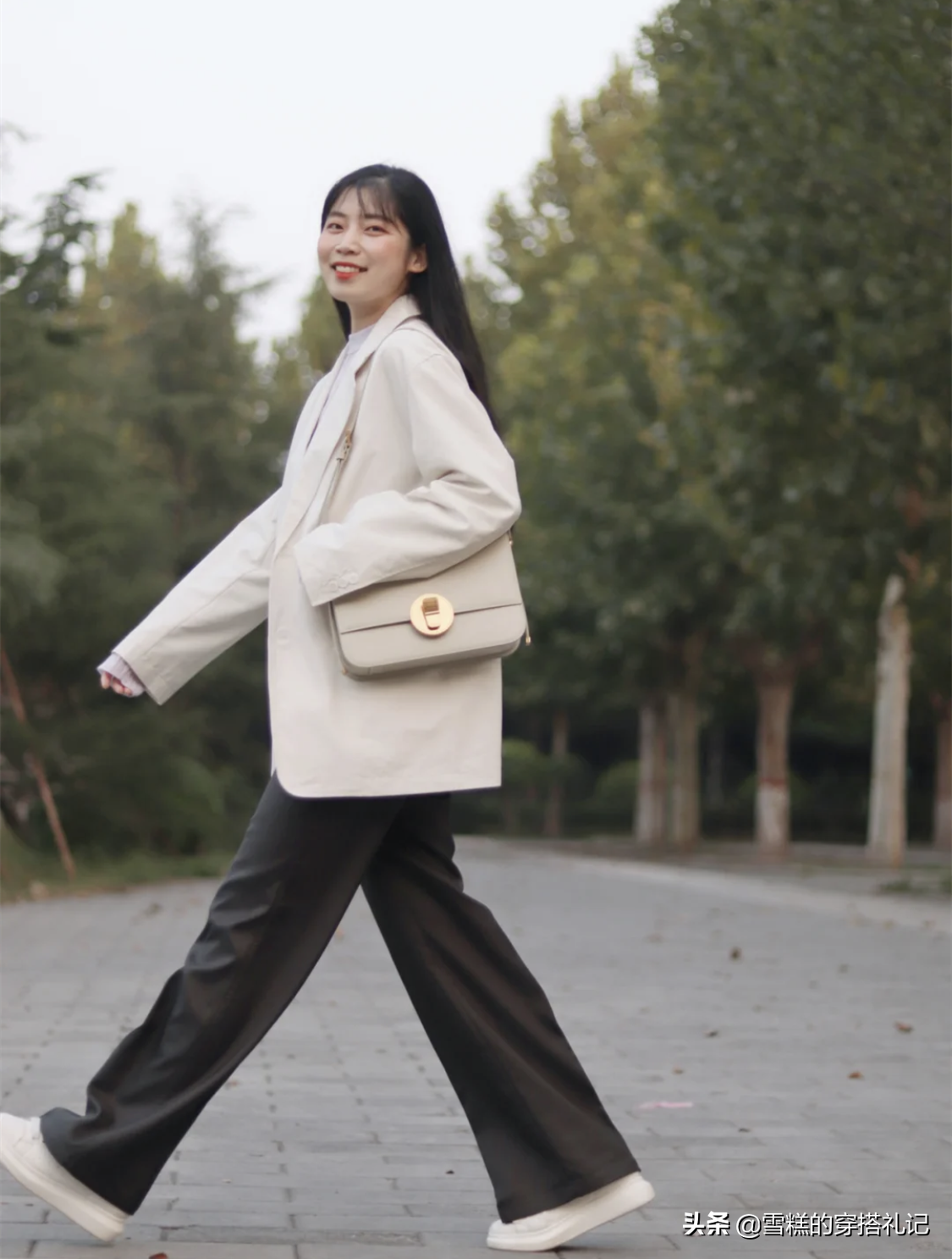 駝色和棕色都屬於大地色系,所以兩種顏色碰撞在一起非常的和諧。不僅能夠打造出整體的協調感,而且大地色系本身就非常適合黃皮膚的亞洲人。鞋子的選擇上可以選擇稍微明亮一些的米白色,這樣讓整體Look有一種漸變的層次感,看起來十分高級。