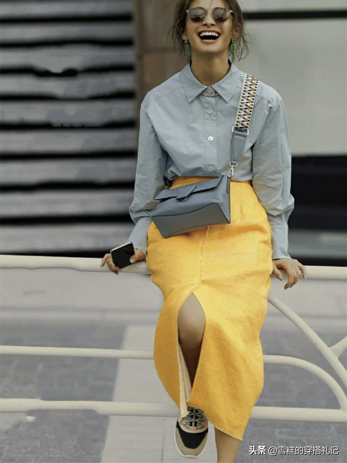 海螺藍屬於冷色調,明亮黃屬於暖色調,所以兩者的碰撞給人的視覺衝擊,可以說是非常強烈的,這也增加了整體Look的時髦感,但是這兩種顏色都屬於比較冷門的顏色,所以在穿著時妝發一定也要跟得上,否則會給人亂穿衣的感覺。