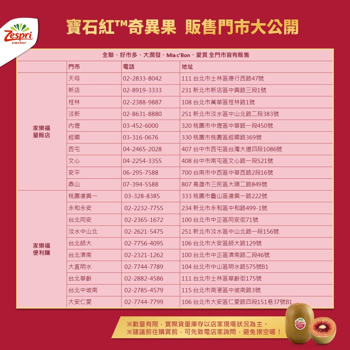 全台限量5萬箱「寶石紅奇異果」,在4月初開賣,預計開賣8周,除了全聯門市外,在大潤發、家樂福部分門市、好市多、愛買、Mia C’bon等地都有販售,售完為止。已有網友透過臉書「我愛全聯-好物老實説」分享好物,紛紛驚呼:「第一次看到紅奇異果,沒想到還蠻好吃的!比綠奇異果小3分之1,但吃起來不會酸!」、「季節限定錯過再等一年」