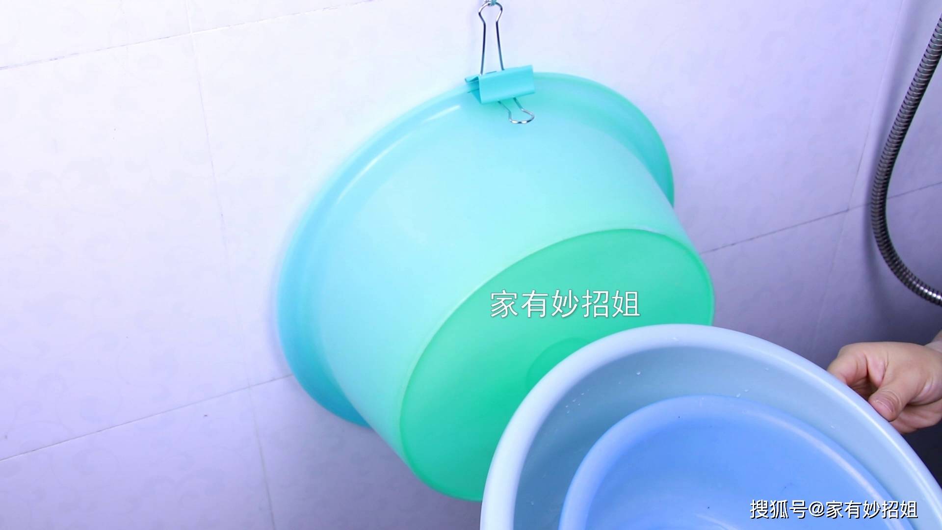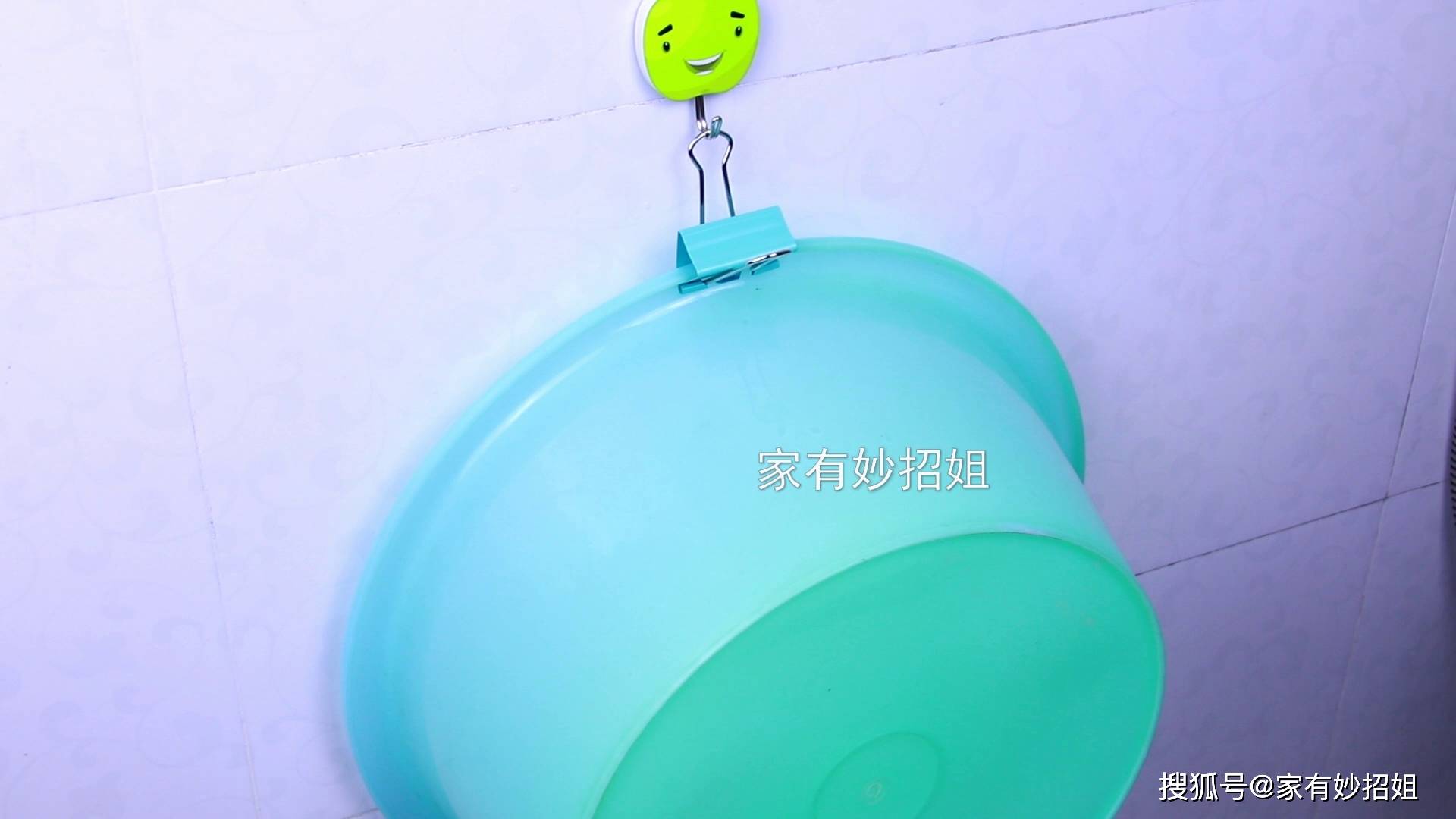 家裡常備的塑膠盆,通常拿來洗腳或洗衣服,但如果放在廁所、其實很佔空間,遇到這種問題時,只需拿上一個長尾夾,把它夾在最大塑膠盆的邊緣,然後在廁所的牆壁貼個掛鉤,把長尾夾的手柄掛在掛鉤上,這樣就可以了。