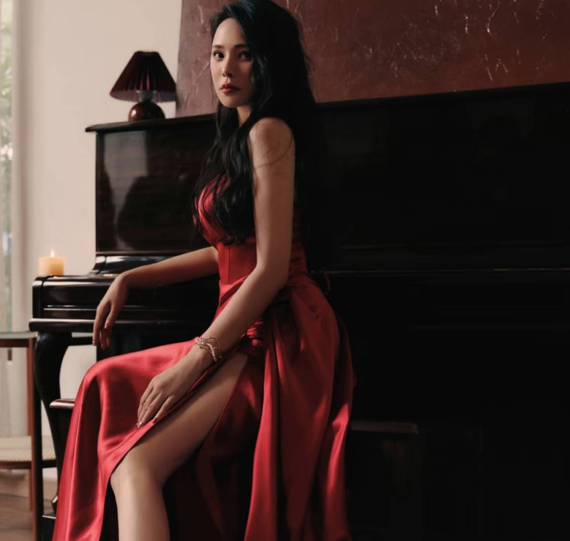 換上酒紅色睡裙,把伊能靜富有女人味的一面徹底展現出來,再梳上大波浪更是具有別樣的美感,