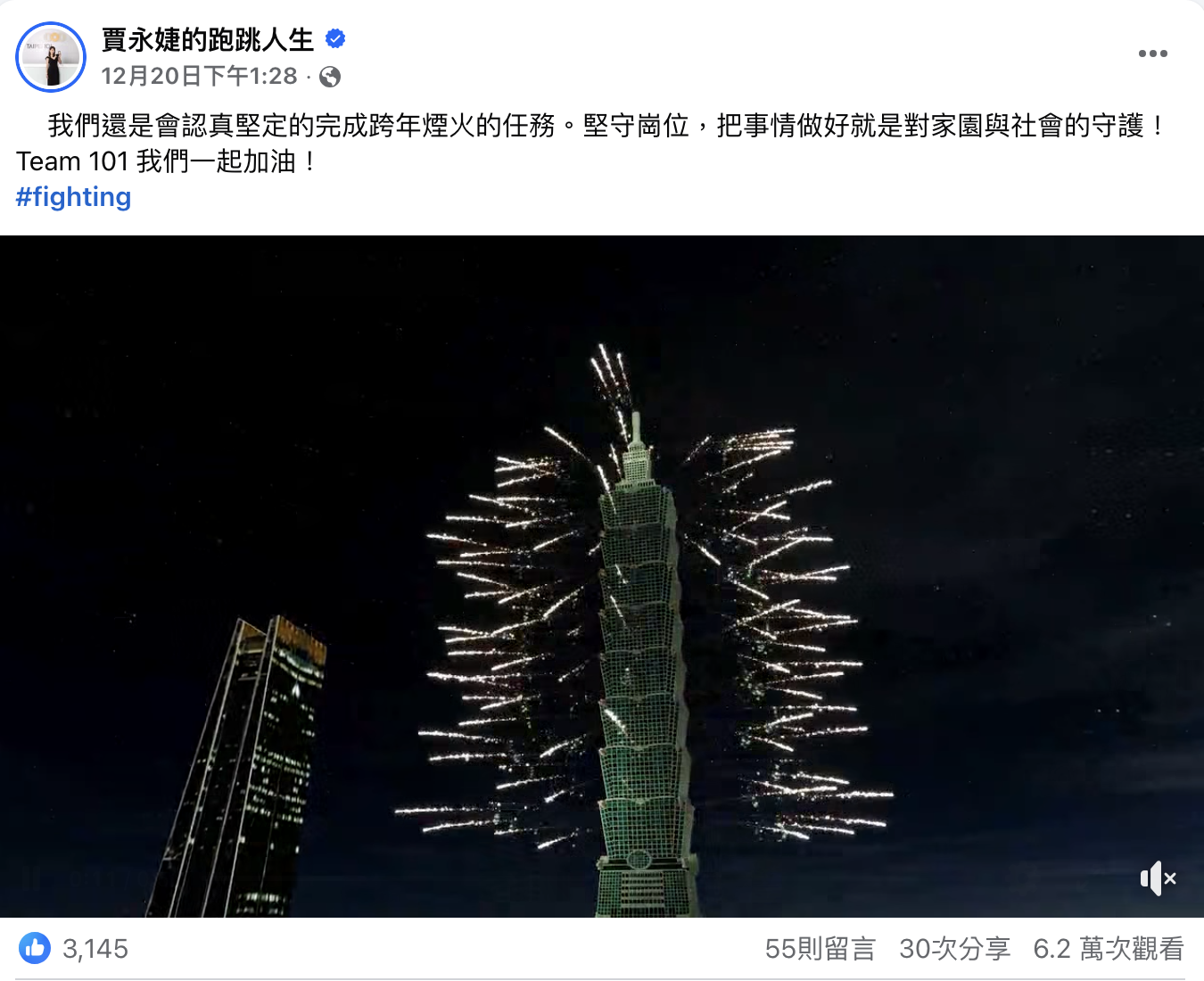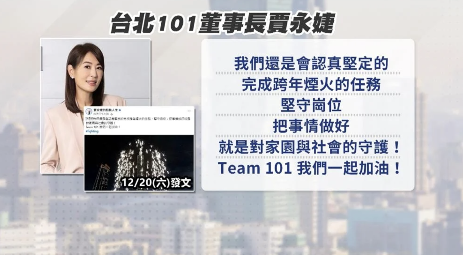 對於跨年活動她也特別發文表示:「我們還是會認真堅定的完成跨年煙火的任務。堅守崗位,把事情做好就是對家園與社會的守護!」指出這本身也是對社會安全的幫助,並強調相信政府能夠做好維安工作。