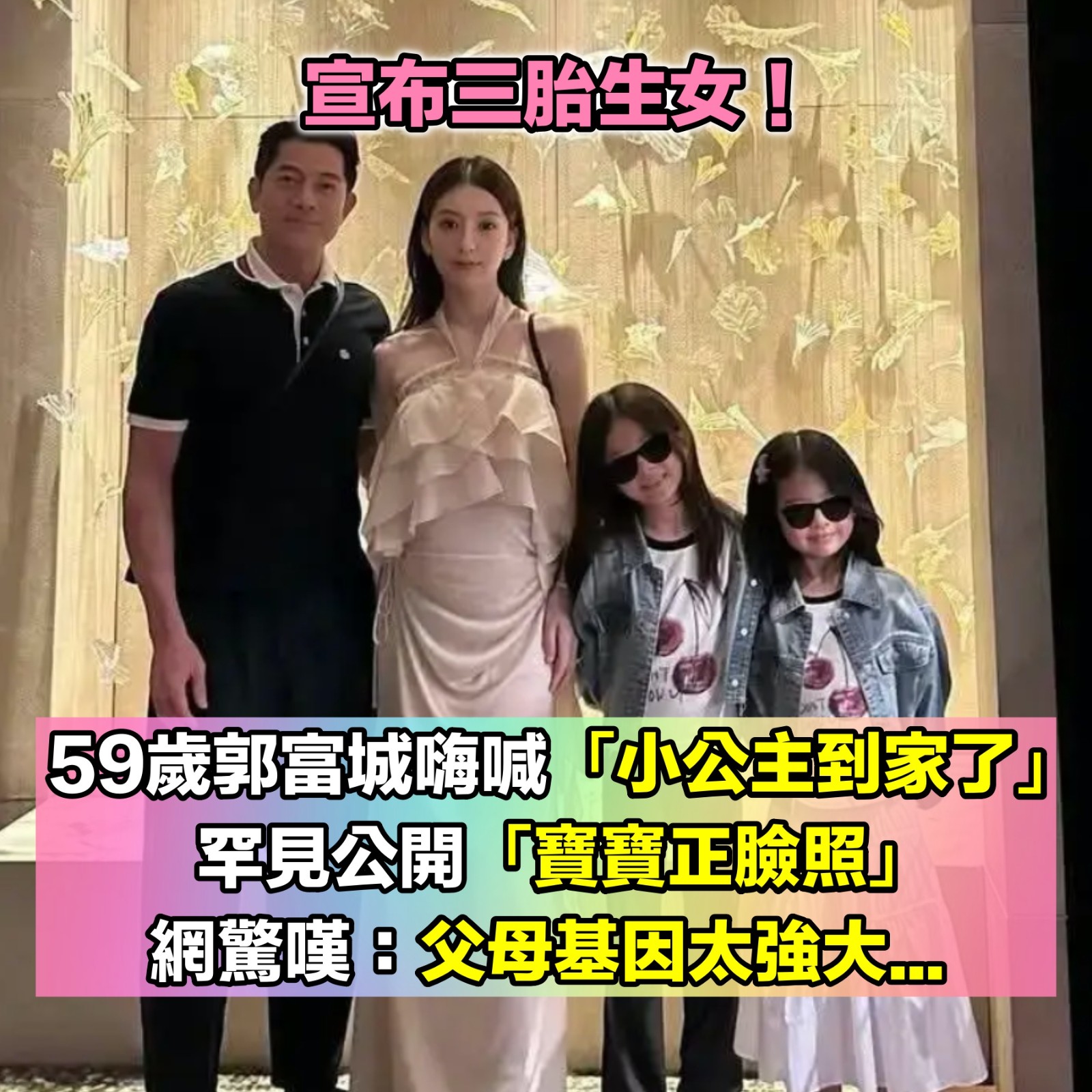 宣布三胎生女!59歲郭富城樂喊「小公主到家了」 罕公開「寶寶正臉照」濃眉大眼超Q 口乎口乎 2025-10-23 檢舉 他還表示,「我們家就是『女神之家』,我是全世界最幸運的男士,被四位女神深深的愛著。請大家和我們一起,歡迎這個美麗的新生命,祝福她健康快樂地成長。」照片裡的寶寶也好可愛,眼睛好大,完美繼承父母的高顏值~資料來源:搜狐 Advertisements 回首頁 2/2 Advertisements 編輯精選推薦 More + 65歲男星獨居暴斃!大咖女星放下恩怨「送前夫最後一程」 昔遭動手6年嘆「死者為大」 模範孝子!比莉罹癌「兒白天工作、晚上睡醫院」 坦言「一滴淚沒掉」:媽媽可以我也可以 旅美多年!資深女星「堅持落葉歸根」回國5天安詳離世 死前「砸600萬做1事」眾人淚目 最新/賈靜雯深夜慟曝「她已離世」 淚PO合照喊:真的好愛你... 再婚2年了!43歲李燕突喊「當媽媽實在太辛苦」 認「已經有愛的結晶」:最完美的幸福❤️ 當年親吻1歲嬰!42年後「對方竟成巨星」同框劉德華 「超高顏值如兄弟」粉絲喊:真的差19歲? 功德圓滿了!台語歌后「悲曝他離世」享壽95歲 淚喊:去當快樂的神仙吧... 45歲本土劇男星「驚曝已婚16年」! 首吐婚姻狀況「愛女是名校學霸」 蔡小虎接噩耗「驅車360里路」南下見她最後一面 「堅持續命3個月」慘痛代價曝光 瞞病情積極工作!51歲影后「住院照曝光」眼神充滿光 丈夫悲慟「臨終前吃流食」:仍盼奇蹟降臨 22歲愛女病逝!資深男星「走不出喪女痛」留白長髮現身 掛骨灰項鍊「代女做1事」惹淚 趕在40歲前閃婚!八點檔女星「宣布嫁給他」 尪驚人身分曝「媒人是柯叔元」 相差18歲!58歲康康自爆「與老婆分房12年」驚呆眾人 提到沈玉琳「坦言罹同1病」:必須警惕... 確診甲狀腺癌!44歲男星「術後近況曝光」哽咽:她為我祈禱 「告白演員愛妻」愛不會停止 15歲兒「睡夢中離世」!本土女星「送愛子火化」求做1事 「PO照圓滿了」:媽媽和你永不分開 本土劇女星生了!7年前凍卵「終於來到我身邊」 歌手尪嗨喊:生個足球隊 晚年隱居台東!68歲名主持失蹤「車內身亡」 伴侶悲曝「死前做1事」:還掛念著我 李英愛輸了!73歲富商尪「超凍齡像40壯年」站一起超登對 「不時甜蜜咬耳朵」網羨慕 離婚11年!洪榮宏愛女結婚「終破冰前妻」 「2爸爸牽她進場」催淚畫面曝 晚年兒孫滿堂!73歲影壇大哥「拄拐杖現身」腳步蹣跚 兒子「全程攙扶不喊累」網羨:又帥又孝順 臨時找不到保母!女學生硬著頭皮「帶寶寶去大學上課」 教授霸氣伸手「寶寶我來抱吧」畫面超溫馨 台灣大咖病逝「享壽83歲」!周遊告別式痛哭「認婚內出軌」:兒子很恨我... 24歲兒失明!于美人爆「他在飯店掃廁所」維生 不盼紅包只求「別再花我的錢」 台語歌后慟別摯愛!告別式上認「早隱瞞病情」 道歉哭喊:原諒我簽放棄急救 以為只是小感冒!本土女星悲痛證實「他併發肺炎過世」 一度淚灑現場「後悔同意插管」