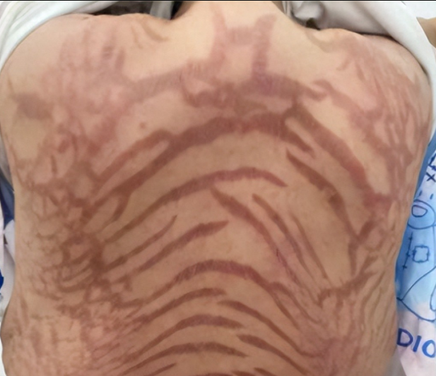 隨著使用時間拉長,女子近期發現身上出現粗大的紫紅色裂紋,像蛇皮般蔓延到背部、胸口及四肢,臉部也腫脹變圓形成「月亮臉」,體重直線上升,還伴隨高血壓、疲倦、腹痛腹瀉等全身性症狀。當雙腿腫脹、手部發麻、頻繁噁心想吐已嚴重影響日常生活時,她才在家人催促下就醫。