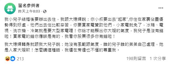 其他人則建議:「大媳婦應該也搬出去,小兒子就是受不了妳才出去,他真聰明。」、「你兒子關媳婦屁事,要買也是你這個當媽的。」、「妳應該要展現婆婆氣度,都買給小兒子,然後再買一樣的給大兒子,再跟媳婦說要什麼都買給妳。」、「我婆婆也講過...當初我們起家,也沒人送什麼,現在反過來要我們送....他們家兄弟姊妹講好就好,不關媳婦的事。」