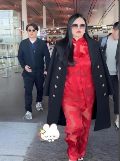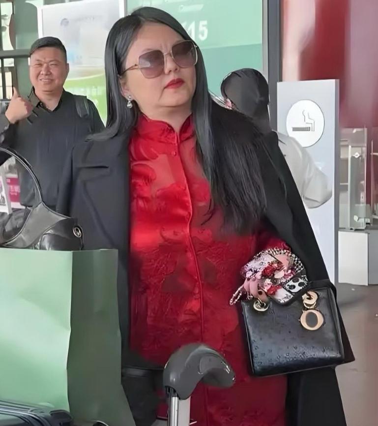 李湘穿著紅色中式套裝,外面披著一件大衣,拿著高奢包包霸氣歸來。