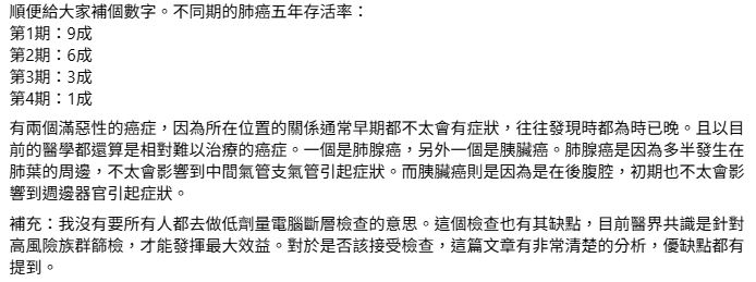 林醫師特別提到,肺癌的5年存活率與發現時期息息相關。若在第一期就確診,存活率可達9成;到了第二期則降至6成;第三期更驟降至3成;若拖到第四期才發現,存活機率僅剩1成。由於肺部位置特殊,腫瘤生長初期往往不會影響到周遭器官,導致早期症狀不明顯,等到出現明顯徵兆時,往往已是晚期。