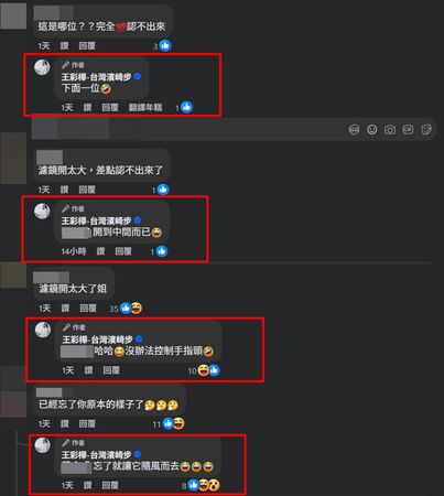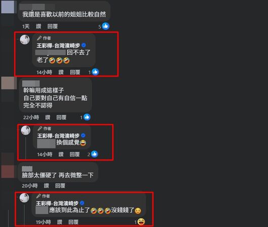 還有網友開玩笑說「現在就是用修圖這招,讓大家忘記原本彩樺長怎樣就對了啦」,王彩樺也大方笑著回覆「換個樣子」,並附上笑出眼淚的表情符號,有粉絲直言「濾鏡開太大」,她也直球回應「開到中間而已~」展現高EQ的應對態度,讓許多粉絲都被她的幽默感逗樂。
