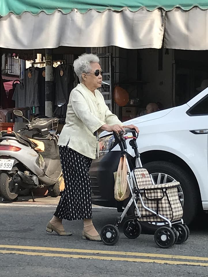 原PO在貼文中以「一個有故事的阿嬤」為題,發佈一張偶然在路上發現的帥氣阿嬤。照片中,這名阿嬤雖已滿頭白髮,但出門買菜行頭一定要帶齊,配戴墨鏡、歪嘴叼菸,雙手則推行格紋買菜車。此外,阿嬤上身穿著傳統服飾,但下身卻又配上波點寬褲與卡其色跟鞋,雖然在搭配上有些衝突,但阿嬤舉手投足間的自信側漏,即使看不出當時表情,也是十分酷帥。