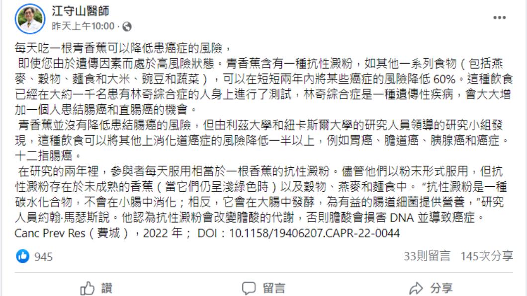 江守山醫師透露,2022年《癌症預防研究》期刊報導,已在近千名「林奇氏症候群」患者身上進行測試,因遺傳因素他們一直處於高風險狀態,而青香蕉含有一種抗性澱粉,研究期間他們讓參與者每天服用相同抗性澱粉劑量,儘管以粉末形式服用,但兩年過後他們體內發現驚人變化!