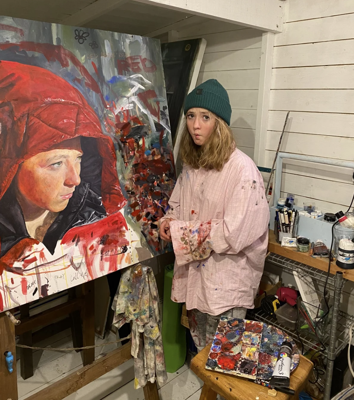 2020年3月剛好是非常時期開始爆發的時候,Makenzy Bear的學校也因此關閉,當時14歲的她突發奇想,試著用媽媽過去的顏料畫布和刷子作畫:「我在想,我為何不在這段時間試試看,可以把繪畫能力升級到哪裡?」結果爸爸就將家裡的垃圾屋改造簡易工作室,一開始那裡什麼都沒有,那裡很黑而且都是灰塵滿佈,她就在這樣的環境下利用手機燈持續作畫。