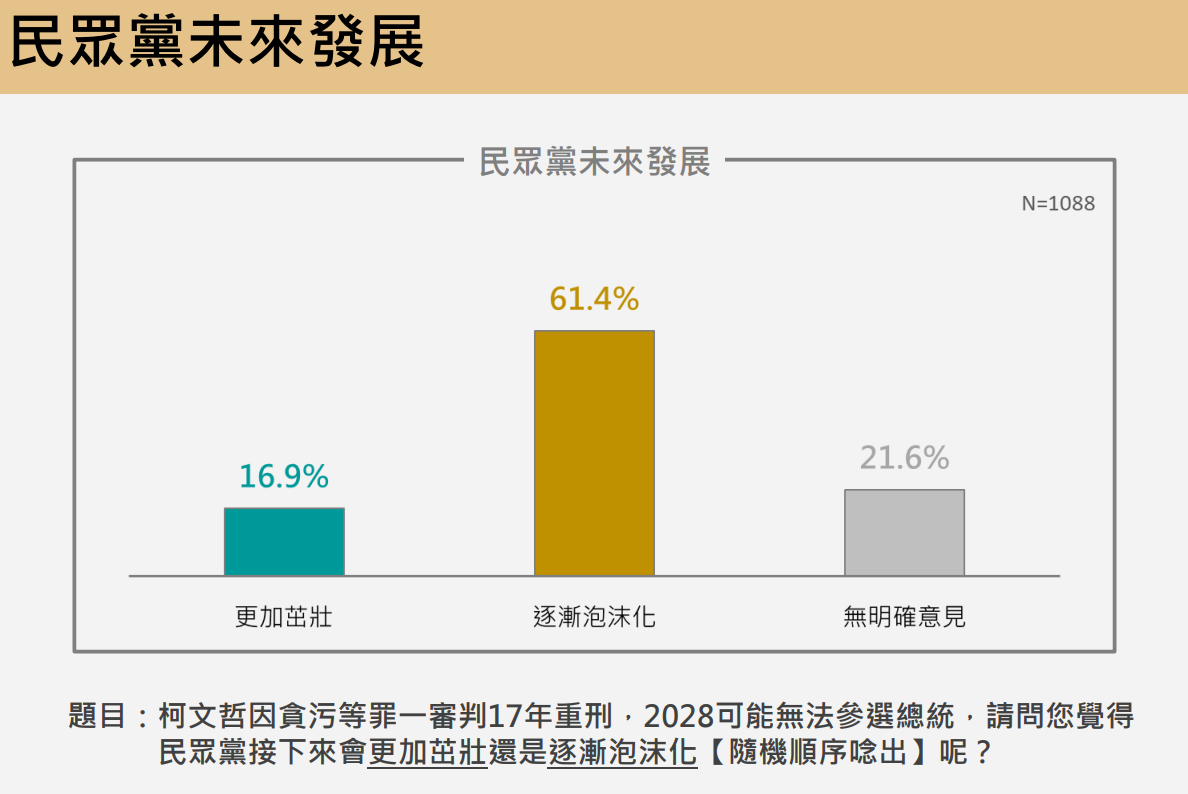 調查數據指出,高達54.2%的受訪民眾表態不相信柯文哲是清白的,其中27.3%完全不相信,26.9%則是不太相信。相對地,僅有29.4%的受訪者願意相信柯文哲清白,包含7.9%非常相信及21.5%還算相信,另有16.4%的民眾無明確立場。