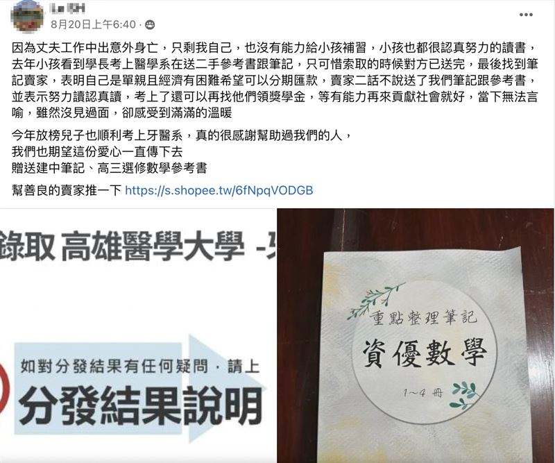 據三立新聞報導,一名單親媽媽在臉書社團「高雄人」發表一篇贈送文,仔細一看內容充滿洋蔥,她表示丈夫在工作中意外身亡,自己沒能力讓小孩補習,但小孩很認書讀書,去年孩子看到考上醫學系的學長在贈送二手筆記和參考書,可惜的是對方已贈完,最後兒子在網路上找到一名賣家,向對方表明自己是單親家庭,且經濟困難,希望能用分期付款的方式來買筆記和參考書。