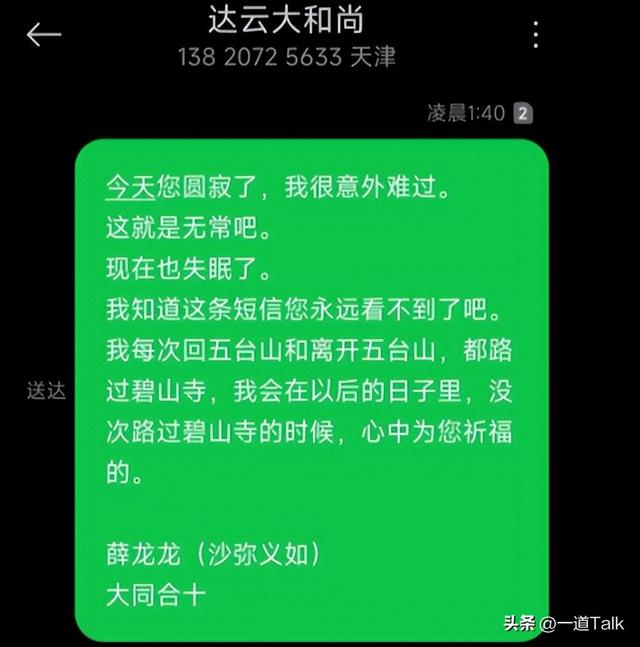 從面相看,大師不是那種心術不正的人!還有網友知道了達雲方丈去世的消息,心痛不已,發簡訊給他表達自己的思念。這位朋友還說,以後每次路過五台山碧山寺,都會在心裡為他祈禱。這麼多人為達雲方丈祈福,可見他生前的口碑。