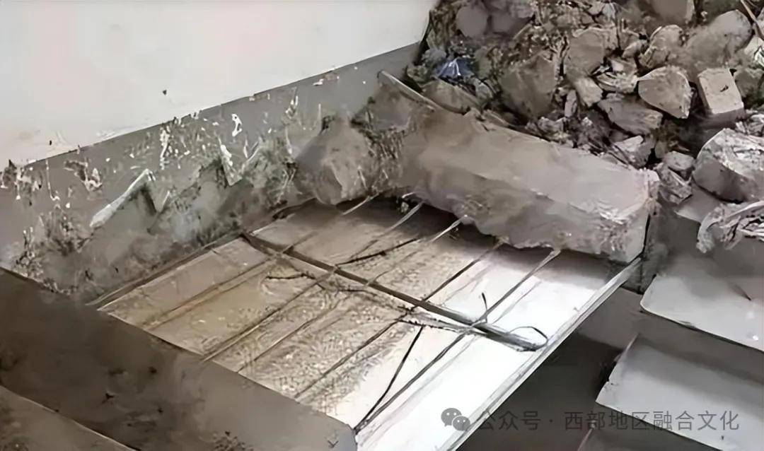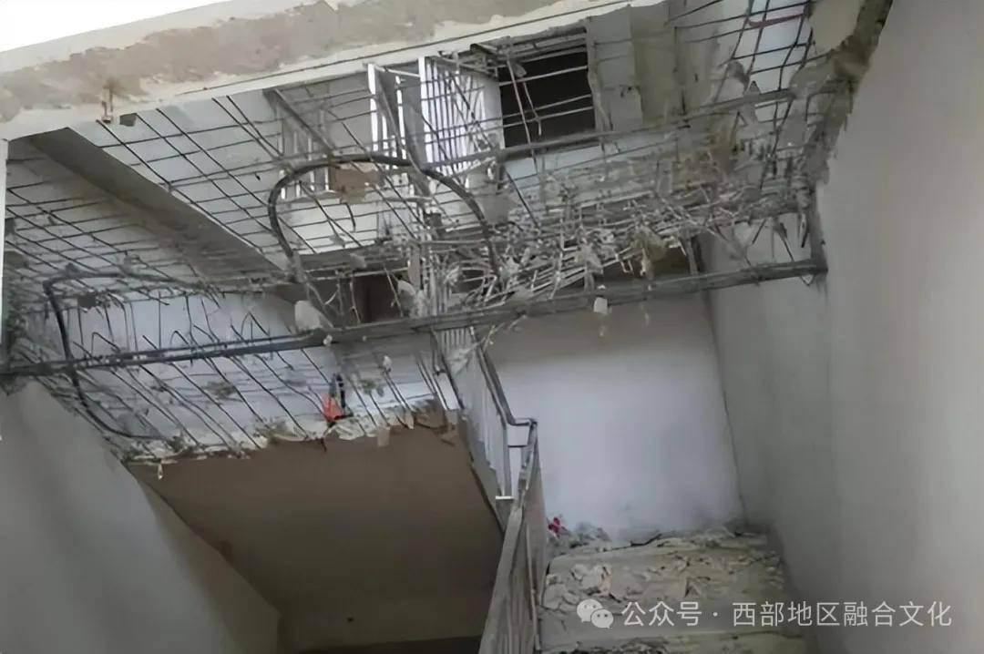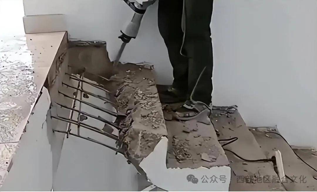 "咚咚咚"的震動聲在狹窄的樓道中迴響,讓人心悸不已。不久,水泥台階被一擊擊敲破,鋼筋裸露,四處散落的石塊令人心驚膽戰。