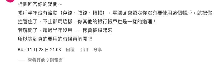 貼文曝光後,大批苦主紛紛現身說法,「我也是網拍買家要匯款時發現異常,已經好幾年沒用郵局了,臨櫃解鎖後櫃員建議半年內至少存錢一次」、「這是最新規定,半年沒使用就凍結,我女兒的帳戶都要定期匯錢進去」。一位自稱是櫃員的網友出面解釋,「帳戶半年沒有任何流動(存款、提款、轉帳),電腦AI系統會判定您不再使用該帳戶,就會自動進行管控。不只郵局,其他銀行也採用相同機制」。許多網友痛批「政府打詐根本紙上談兵,受苦的都是一般民眾」、「打詐政策超級擾民」。