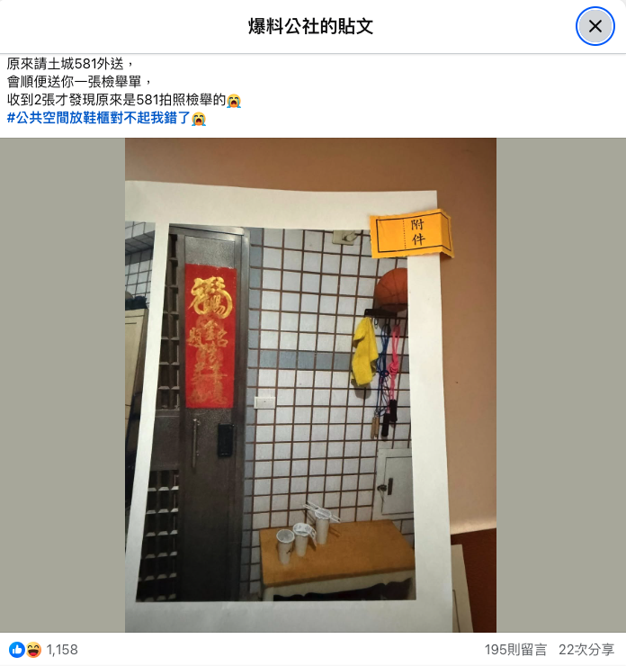 外送員依照指示完成任務後,按照平台規範拍攝了送達證明照片,原本以為一切就這樣結束了。沒想到幾天後民眾卻收到一張「罰單」,他才知道被報復了!這位民眾收到一張罰單通知,原因是他家門口的鞋櫃被人檢舉占用公共區域,必須繳交高額罰款。