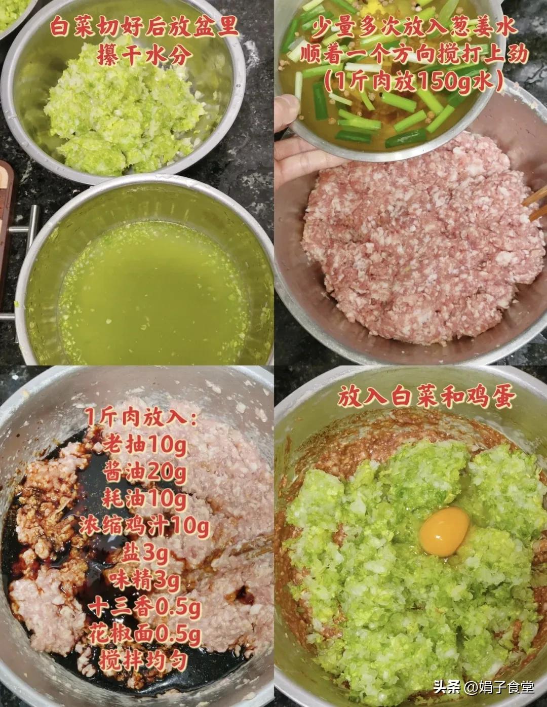 3、一斤豬肉絞成肉餡,然後少量多次的打入蔥姜水,沿著一個方向用力攪拌,每一次都等肉餡完全吸收水分以後再加下一次。蔥姜水打好以後,按照下圖的調料比例給肉餡調味,沿著一個方向充分攪拌至肉餡上勁。