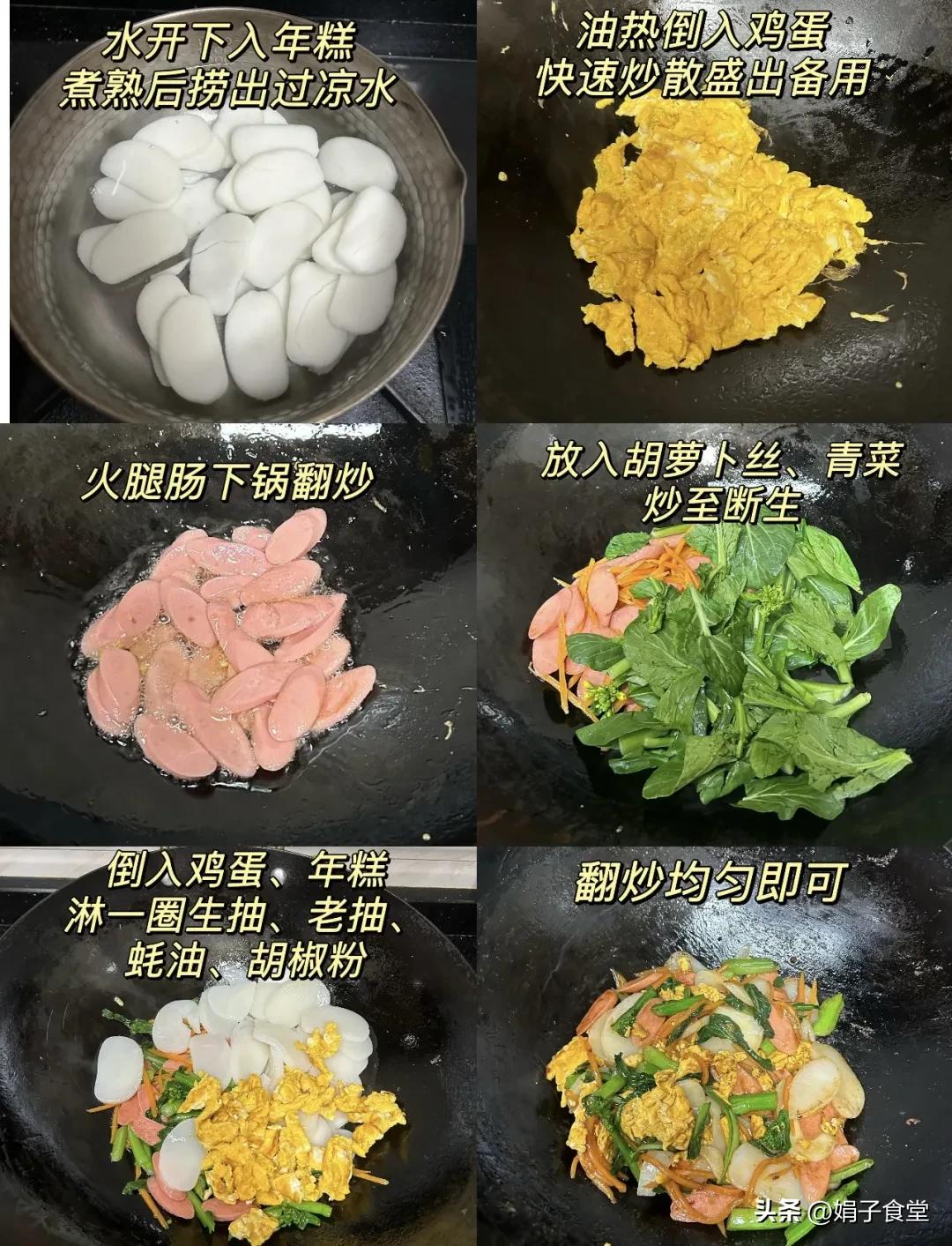 食材:年糕、雞蛋、青菜、胡蘿蔔、火腿腸、生抽、老抽、蚝油、胡椒粉