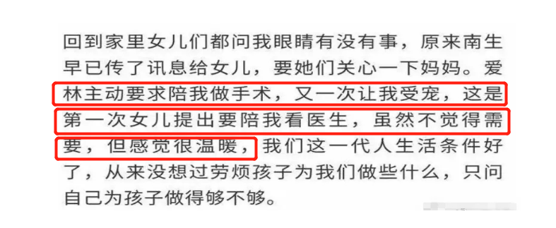 更讓她受寵若驚的是,因為這件事讓女兒對她更關心了!過去為了避免被狗仔偷拍,林青霞一直小心翼翼保護家人,避免和女兒一起出門,導致一起在外面相處的機會非常少,隨著年紀增長她們也有自己的事需要忙,這次女兒們從友人那裡得知她要動手術,都非常關心她的身體狀況,就連忙於工作的女兒愛林,也主動要求陪她做手術,在外面小辦公室等待手術的她們,終於能夠彼此談心暢聊,讓她很感謝打球擊中她的朋友,坦言「塞翁失馬,焉知非福」她已經從中獲得兩個意外的驚喜了!