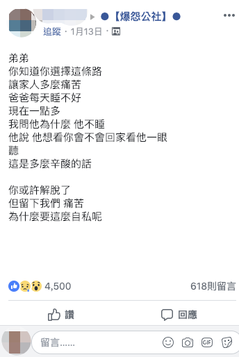 沒想到爸爸聽完之後,只是淡淡地說:「想看你弟弟會不會回家看我一眼」,短短的一句話讓原po理智線瞬間斷裂,感到窒息般的難受,於是傷心又有點氣憤地在網路上向弟弟抱怨:「你聽,這是多麼辛酸的話,你也許是解脫了,但卻留下我們繼續痛苦,為什麼要這麼自私呢?」