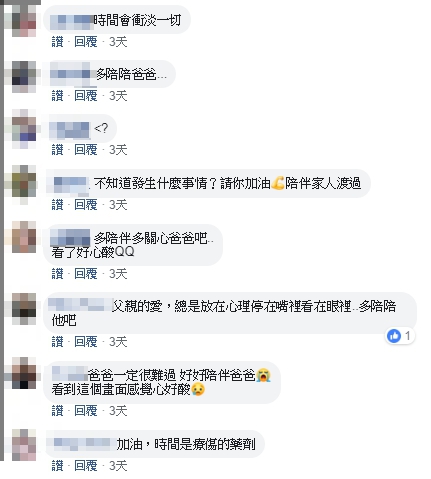 不少網友看完這則貼文後,都寫下鼓勵的話替原po打氣,表示「爸爸一定很難過,好好陪伴爸爸,看到這個畫面感覺心好酸」、「父親的愛,總是放在心裡、停在嘴裡、看在眼裡,多陪陪他吧」、「時間會沖淡一切的,你們都要加油!」、「真的是心中一輩子的痛」、「時間是療傷的藥劑」。