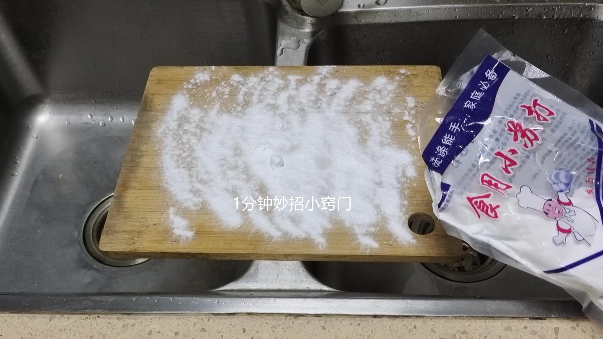 首先,我們在菜板上面撒上一些小蘇打,小蘇打有很好的清潔作用,不但可以用來加工麵食,平時,對於餐具的一些清潔,也是有很不錯的作用,可以用來清洗碗筷,清潔菜板,效果也是比較不錯的。