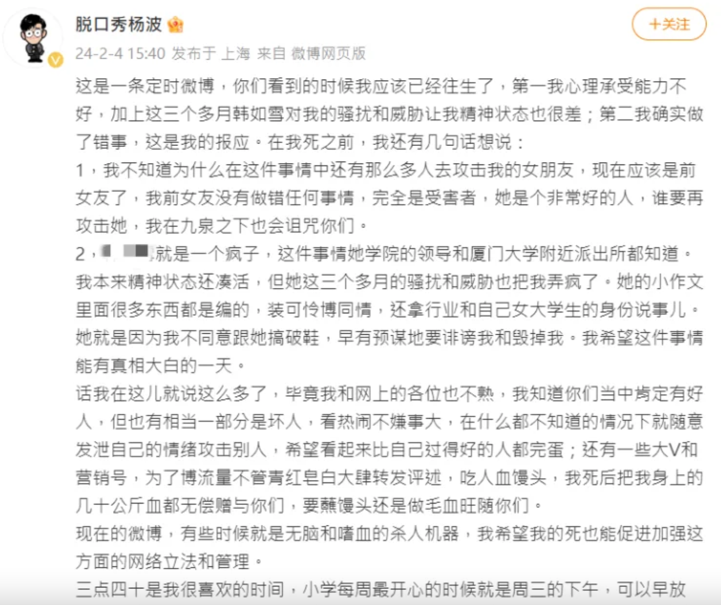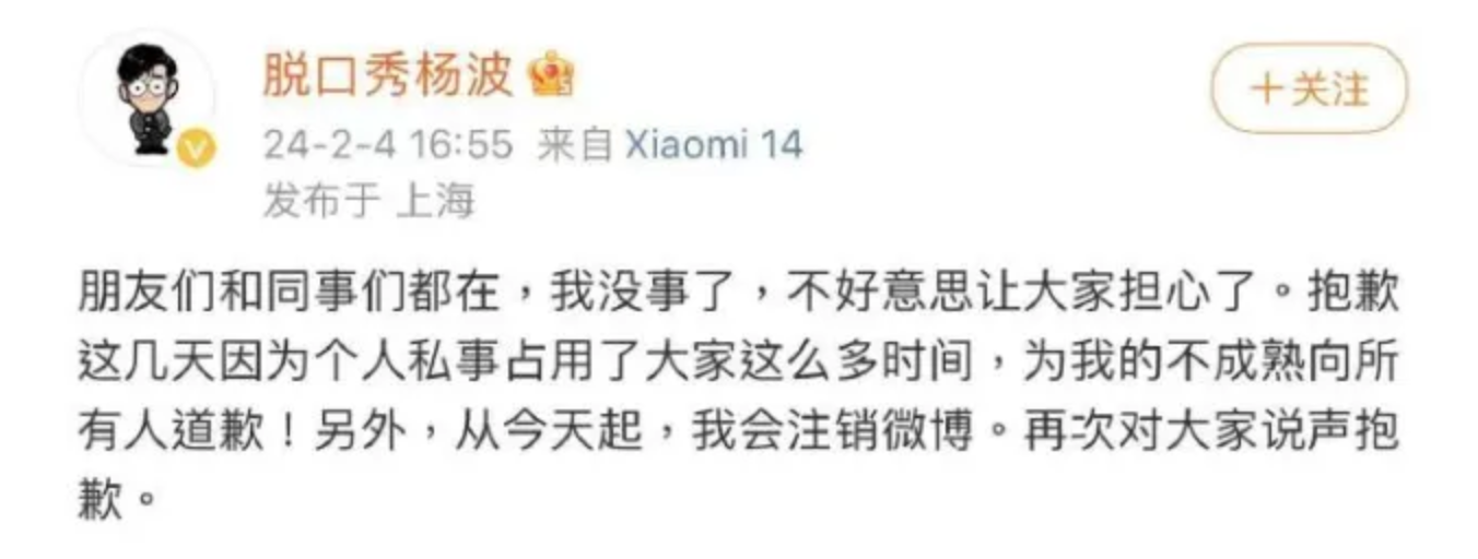 然而在那之後,楊波突然以預排文章的形式發文,「你們看到的時候我應該已經往生了,第一我心理承受能力不好,加上這三個多月女方對我的騷擾和威脅讓我精神狀態也很差;第二我確實做了錯事,這是我的報應」,讓粉絲們大為震驚。但在不久後,他卻又發文致歉,「朋友們和同事們都在,我沒事了,不好意思大家擔心了。 抱歉這幾天因為個人私事佔用了大家這麼多時間,為我的不成熟向所有人道歉」。他也言明會將社群刪除,終結這起出軌鬧劇。