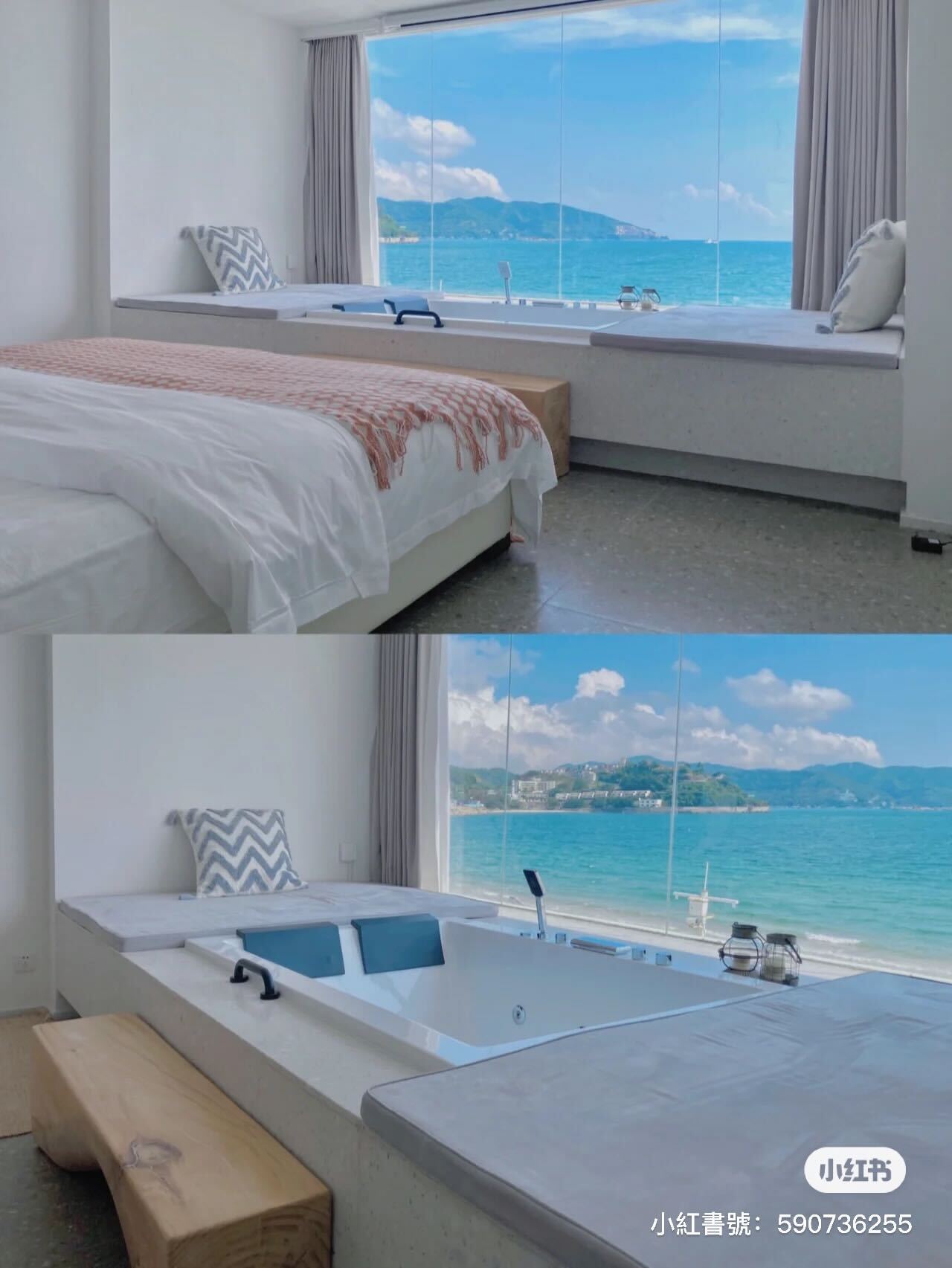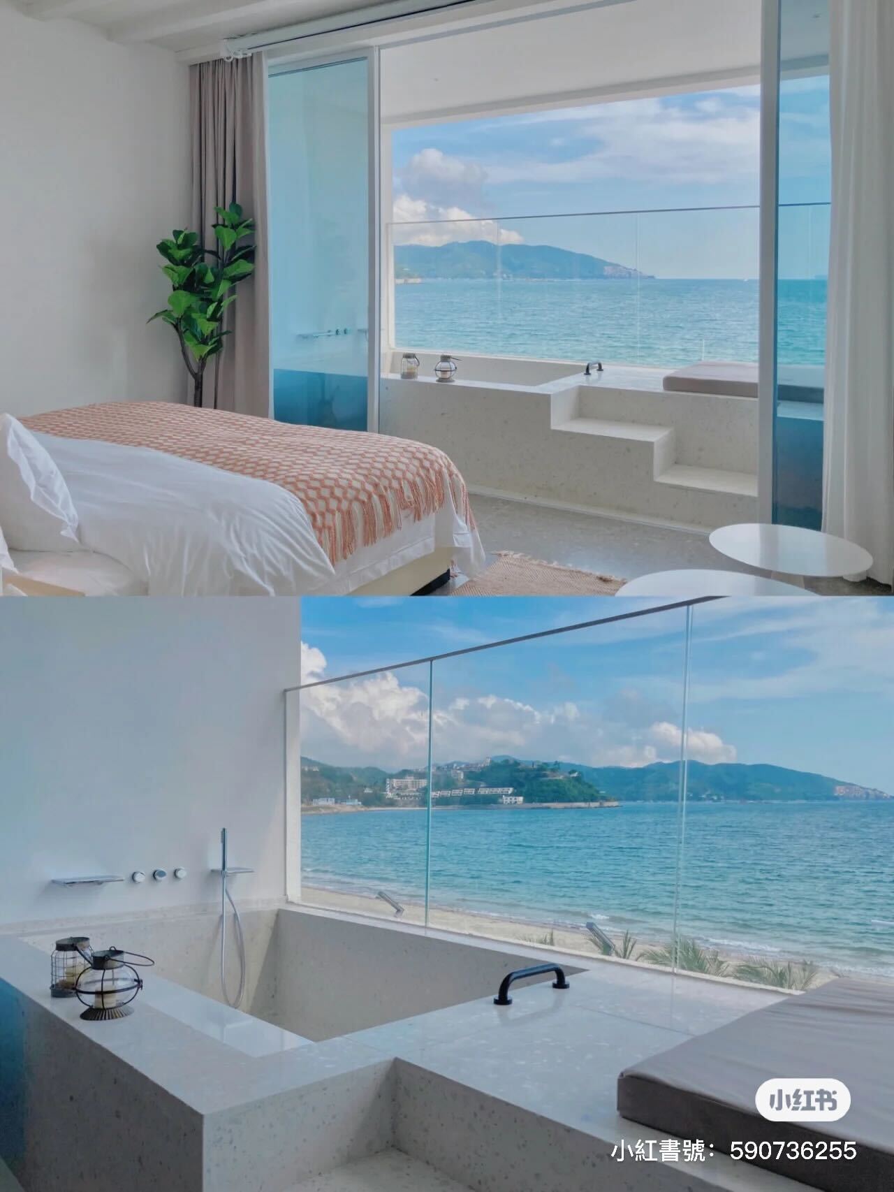 這間位於深圳的夢幻海景民宿「白房子·美宿」有著超美的面海大窗戶,向兩邊打開後就能看到沒有盡頭的遼闊蔚藍海面,窗戶外是半露天的大大浴缸,邊泡澡邊看著海浪在身旁拍打,真的好浪漫又好愜意呀~