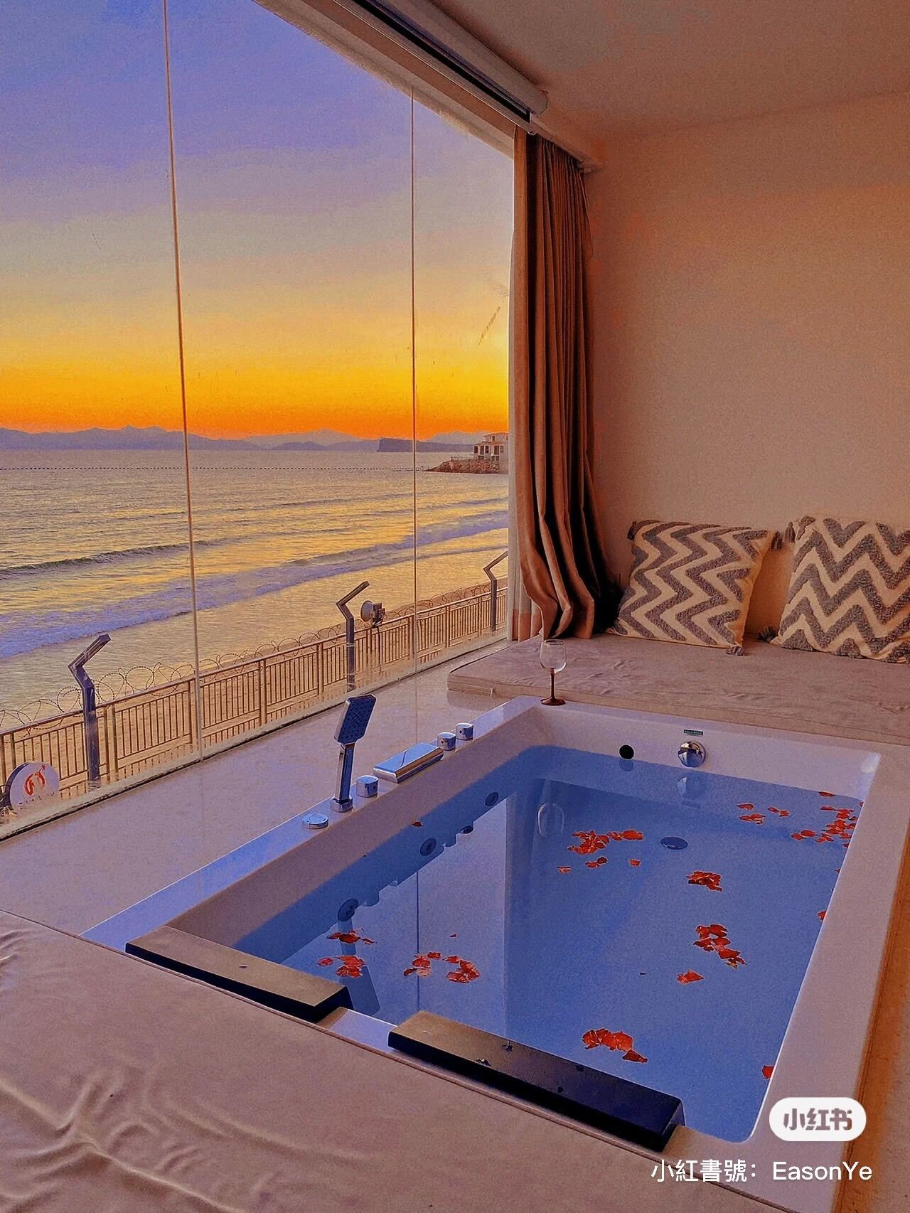 運氣好的話還可以看到絕美的夕陽~橘黃和粉紫色的彩霞落在海面上,就像是染上水彩顏料的調色盤,在天空和海面揮灑出最美的畫面!這時候泡進灑上玫瑰花瓣的浴缸裡,浪漫氣氛真的超級無敵!!