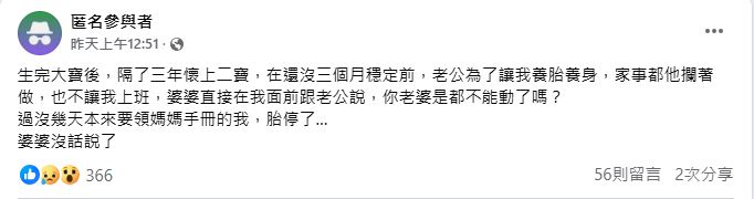 據《ctwant》報導,原PO生完老大後,隔了三年才迎來老二,因為尚未過三個月穩定期,老公為了讓她好好養身體,家事都扛下來做,也不讓原PO上班,「婆婆直接在我面前跟老公說,你老婆是都不能動了嗎?」幾天過去,她開開心心前往醫院準備領媽媽手冊,卻被檢查出胎停,「這下婆婆沒話說了...」