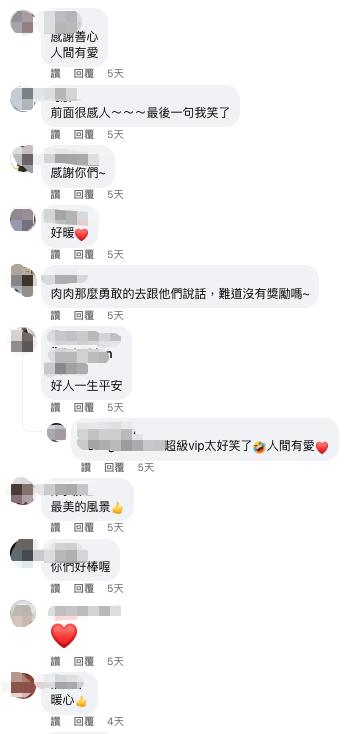 事件曝光後,立刻引起數千人按讚,許多人都感動稱讚這對夫妻的愛心:「你們好棒!最美的風景!」、「你們夫妻都是大好人!」、「看完好感動喔,眼淚在眼框打轉...」