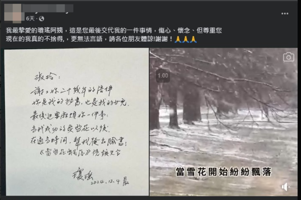 這封珍貴的親筆信中,瓊瑤以她一貫優美的筆觸寫道:「淑玲:謝謝妳二十幾年的陪伴,妳是我的秘書,也是我的女兒。」更令人感動的是,她以詩意的方式交代身後事,請求秘書在她「成功地變雪花以後」,適時在臉書發布《當雪花飄落》的影片與文字。這份溫柔的交代,展現出大師對生命的優雅態度。