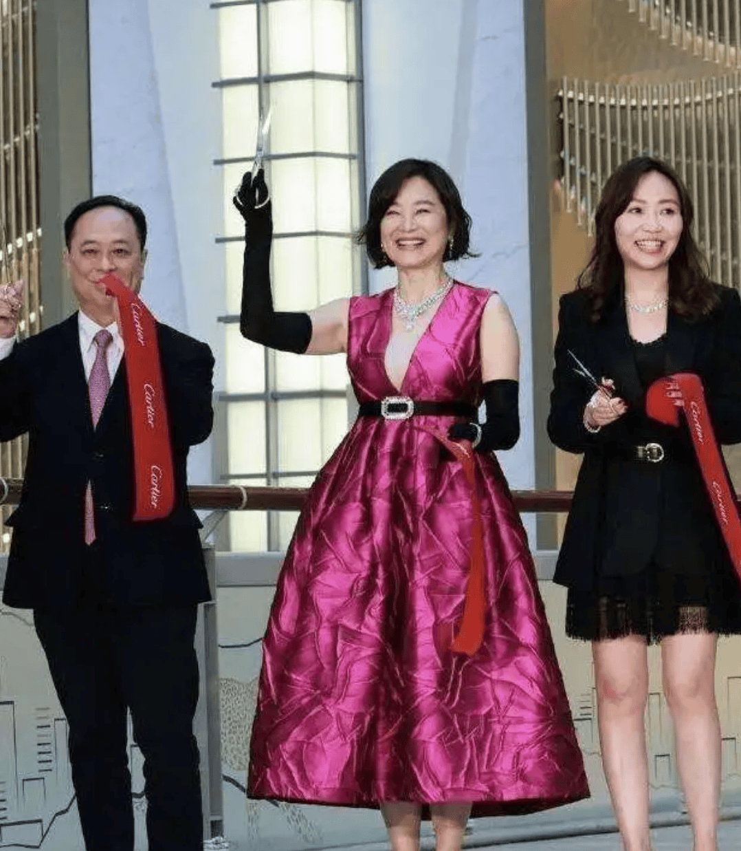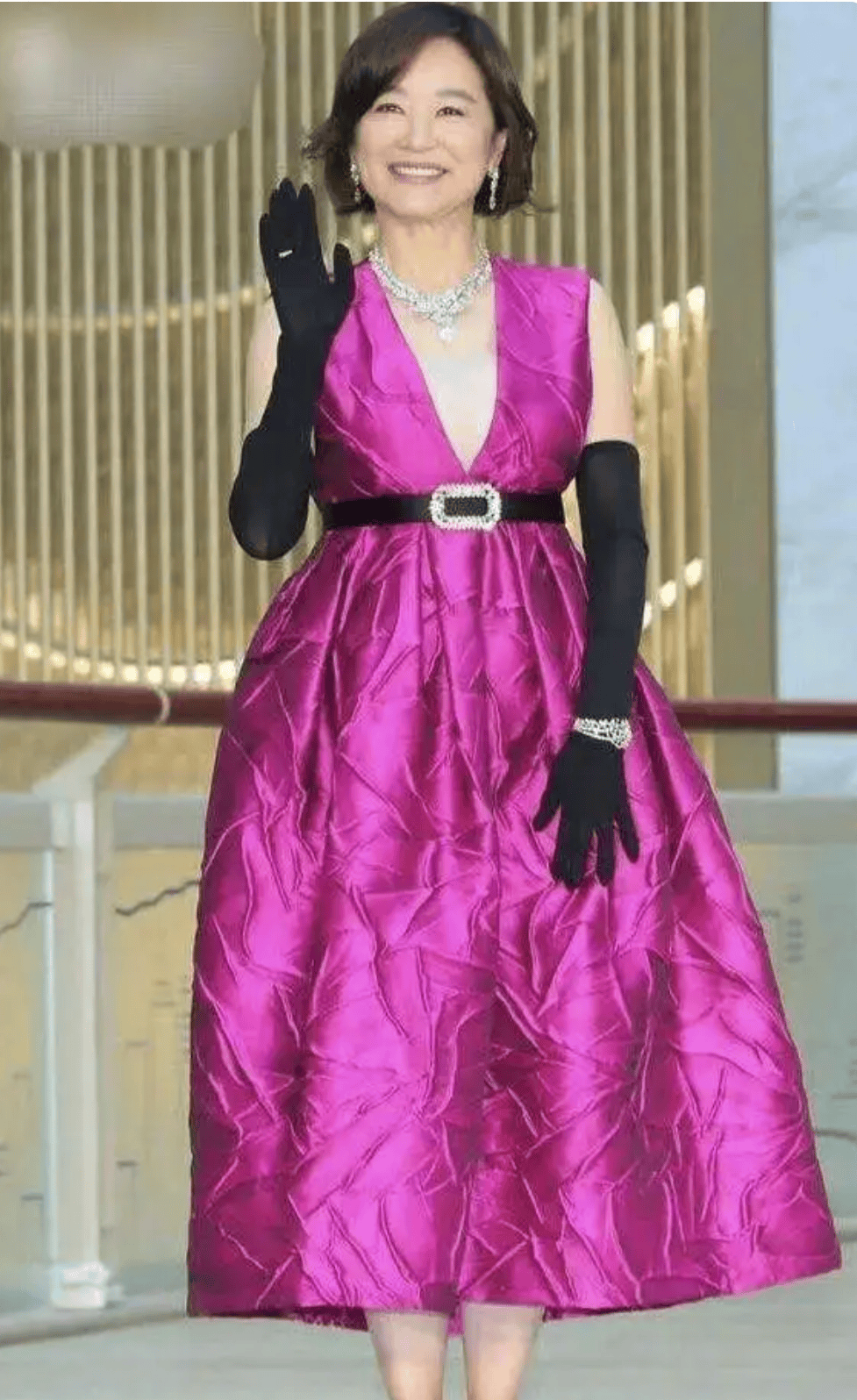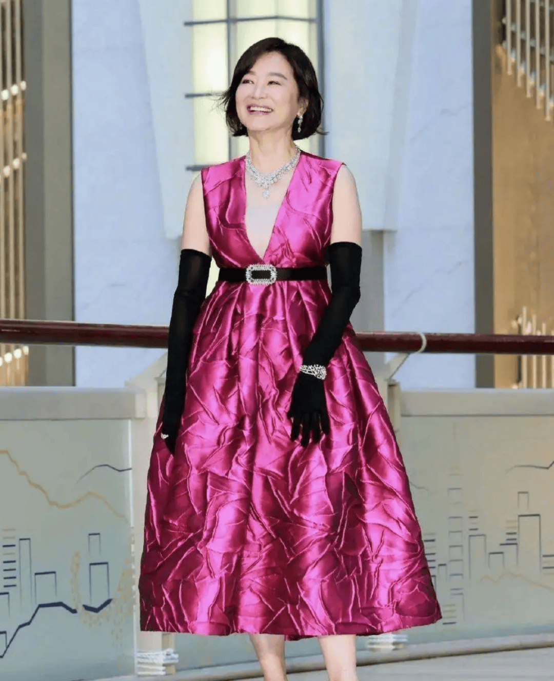 玫紅色本是死亡色系,穿不好就是村口二妞。可林青霞偏要挑戰,綢緞面料隨著步伐流動出霞光,深V領口開到心口卻半點不俗,反倒襯得鎖骨像天鵝展翅。最絕的是珠寶搭配,鑽石項鏈如銀河傾瀉,耳墜隨笑容搖曳生姿,這哪裡是戴珠寶?分明是珠寶在蹭她的貴氣!