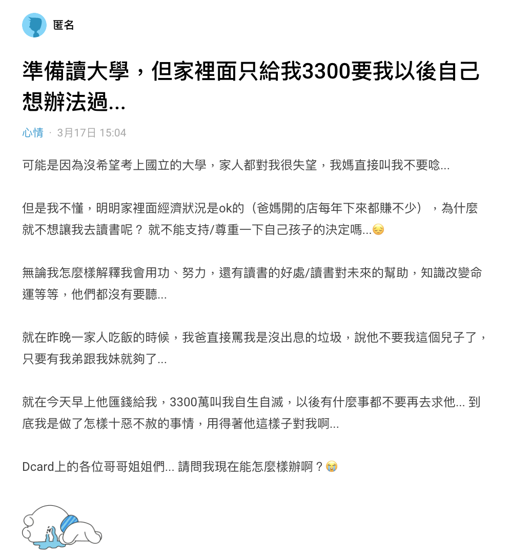 沒上國立大學!他被爸媽趕出家門「不要這個兒子了」 他崩潰喊「只給我3300萬」:要我自生自滅 別問我素隨 2023-03-20 檢舉 (來源:dcard)許多網友看到貼文後,紛紛留言回應:「這錢夠你重讀好幾次台大醫學系」、「3300萬還擔心?我們家家產全部都沒3300萬」、「一半拿去付學費、一半投資都綽綽有餘了」、「你算一下這錢你要賺多久」不過也有網友對文章真假保持懷疑,認為如果對方可以拿出存摺明細的話,才能相信他所說的~不知道大家有什麼看法呢?3300萬也太多了吧...來源:dcard Advertisements 回首頁 2/2 Advertisements 猜你會喜歡 婚前遭婆家嫌棄!單腿女孩被悔婚「爺爺走了、爸媽生病」工作頻受排擠 轉念靠自己「畫面振奮人心」 白天剛通過電話!半夜又接到母親來電「不說話只是哭」 他連夜開車回家「見到爸媽」後泣不成聲 沒幫寶寶買機票!無良爸媽竟「將他留報到櫃台」 試圖「闖關安檢」登機:快遲到了 編輯精選推薦 More + 快訊/高雄建商父女「驚傳1死1傷」!家屬崩潰:「他留下一封遺書...」 快訊/至少30人身亡「遺體堆滿地」!政府緊急宣布「全面停課」 煮飯飄出肉香味!吃素鄰居「聞到想吐」要求關窗 寫信下「最後通牒」掀兩派論戰! 北捷嬤逼讓座遭踹飛!台大教授一看「驚曝她真實身分」:中研院女魔頭 相約屏東遊玩!27名大學生「爆死亡意外」 緊急搜救「7小時後宣告不治」 遭家暴仍死心踏地!吳婉君驚傳「秘密複合趙駿亞」魂被牽走 閨蜜氣斷交「本人鬆口回應了」 乖孫睡覺被吵醒!他聽到「屋裡傳怪聲」撬開天花板 驚見「18萬隻密集狂竄」嚇壞求救 姊姊結婚了!連體嬰姐妹花「共用下半身」 被問「與老公私密話題」3人全說了 赴花蓮救災!45歲主持人遭酸「穿綠背心作秀」 他曝五進災區心聲:「很委屈」 祂走5年了!當紅男星「36歲倒地猝逝」震驚全台 老父迎65歲「眾星雲集祝壽」:在天上可以放心了 最新/3度中風送醫!資深男星爆離婚「斷50年髮妻」 「砸1億淨身出戶」家族爆紛爭 快訊/北市內湖公寓「驚傳雙屍命案」!40歲母、10歲女童「明顯身亡」 花蓮堰塞湖14死!49歲台灣女星「光復老家遭沖破」 她悲喊「轎車被捲走報廢」受災現況曝光 萬人湧花蓮救災!台灣鏟子超人「感動全球」登上國際 韓網友「提2質疑」:好奇怪的行為 他35歲不上班、不結婚!「花16萬改造洞穴」隱居至今 「一踏進去」網友全大開眼界 女演員驚傳「墜5公尺當場身亡」!全場目睹嚇傻「市長痛心回應」 失態畫面全被拍!71歲成龍突「伸手摸女星美背」遭砲轟 眼尖老闆「出手神救援」網讚翻 當年夢中女神!突淡出演藝圈「整個人腫好幾圈」 再現身「竟消風神回春」 不管和誰聊天,都不要聊這10件事!否則顯得你很蠢... 照顧公公15年!90歲公公中秋節前「叮囑三兒女回家」 「拿出一個布包」我一打開淚流滿面 豔照門17年過去!45歲張柏芝被問「為何讓陳冠希拍攝」 她聽完「淡淡回5字」惹網友心疼 影后與歌王驚爆「19年婚姻玩完」!知情人曝「已分居數月」:獨留妻子顧2女兒 鏟子超人救花蓮!政壇大咖逆風喊「不要再去災區」 曝嚴重後果:「害慘全台灣...」 兒子在高鐵上吃泡麵!味道擴散被乘客辱罵「沒教養」 爸爸回一句話「理性又霸氣」令其當場噤聲 好不容易考上醫科!22歲女學生「緊急送醫急救」 當爸媽的面「自己拔掉氧氣罩」:別再救了...
