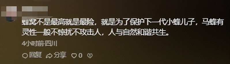 還有網友表示,蜂窩不是最高就是最險,就是為了保護下一代小蜂兒子,馬蜂有靈性一般不驚擾不攻擊人,人與自然和諧共生。