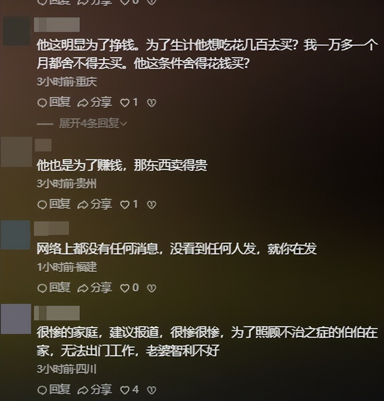 也有不少網友在評論區裡面證實,都說這個小伙的家庭非常的慘,除了有一個生病的伯伯,還有一個嗷嗷待哺的孩子,而且他的妻子也有一些問題。
