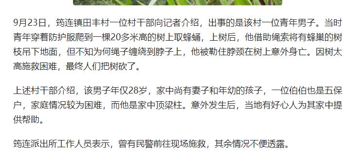 四川28歲男子上樹取蜂蛹,被自帶繩子纏住脖頸意外身亡---2025-09-23---極目新聞